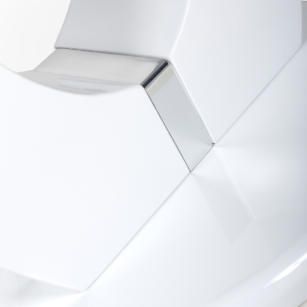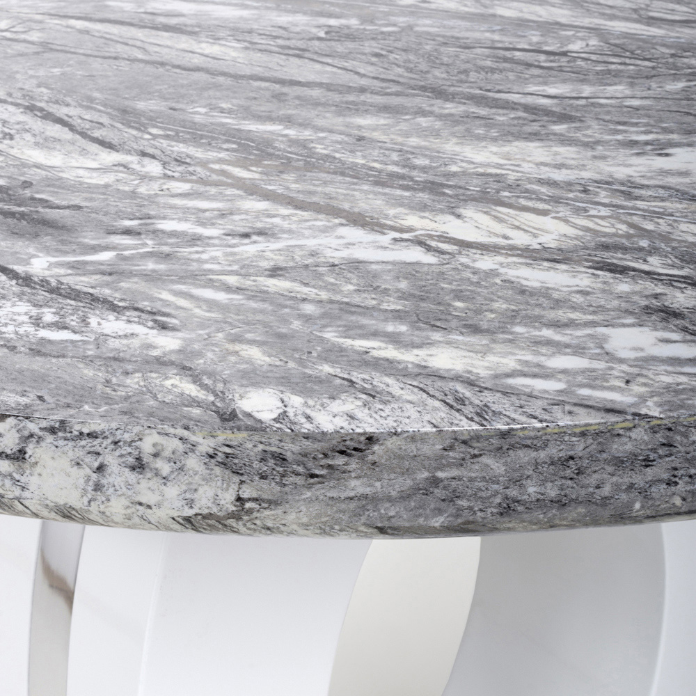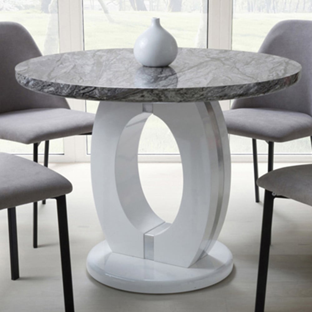This round dining table offers a harmonious blend of classic and modern aesthetics. The marble-effect top sits atop a distinctive white, high-gloss circular base, accented with elegant chrome trim detailing. Please note that this listing is for the dining table only; chairs are sold separately. Some assembly is required. Sold individually, the unique design is sure to make a statement in any dining space.