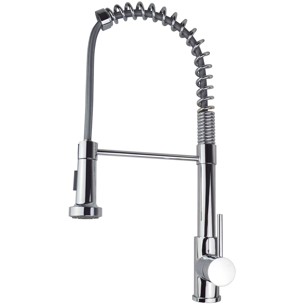 This kitchen tap showcases a distinctive design, featuring a chrome hose complemented by a coiled, spring-like surround in chrome. The detachable spout transforms into an extendable, flexible hose, perfect for effectively cleaning your basin and surrounding work surfaces. A single lever handle, finished in polished chrome, completes the look.