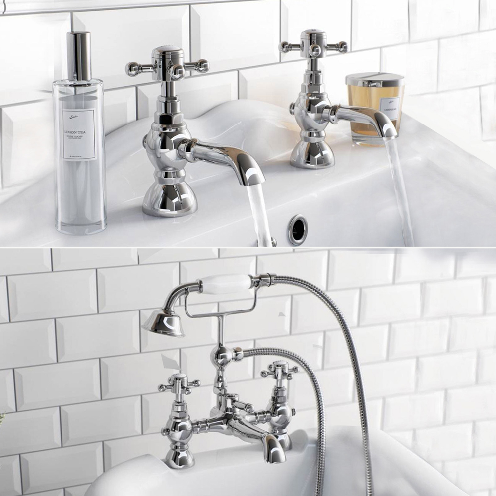 This traditional set of hot and cold basin taps, along with a bath shower mixer tap and handheld kit, introduces an elegant aesthetic, seamlessly merging classic and contemporary styles in your bathroom. Featuring traditional crosshead handles for ease of use, these taps offer both style and practicality. The basin taps showcase a classic twin design, complete with full-turn cartridges, and are designed for straightforward installation, compatible with UK standard sizes. The bath shower mixer tap also features cross handles and includes a diffuser in the spout to ensure a non-splashing water flow. With a ceramic cartridge for precise control over water flow and temperature, these taps boast exceptional build quality. The highly polished, three-layer PVD chrome finish not only provides a silky smooth feel and a mirror-like shine but also guarantees durability and resistance to tarnishing and corrosion, thanks to their solid brass construction.