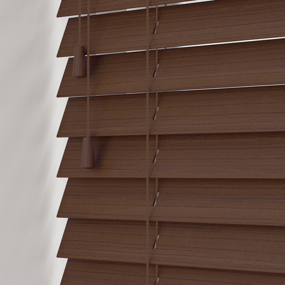 Enhance your home with the Chicago collection Venetian blind. Its luxurious, moisture-resistant faux wood finish in a rich chocolate colour offers a stylish alternative to shutters. The wide, robust slats maximise natural light. This premium blind features a colour-coordinated right-sided raise cord and left-sided slat control for ease of use, a strong headrail, and full guides for simple installation. Meeting all child safety regulations, this blind is available in a 130cm width.