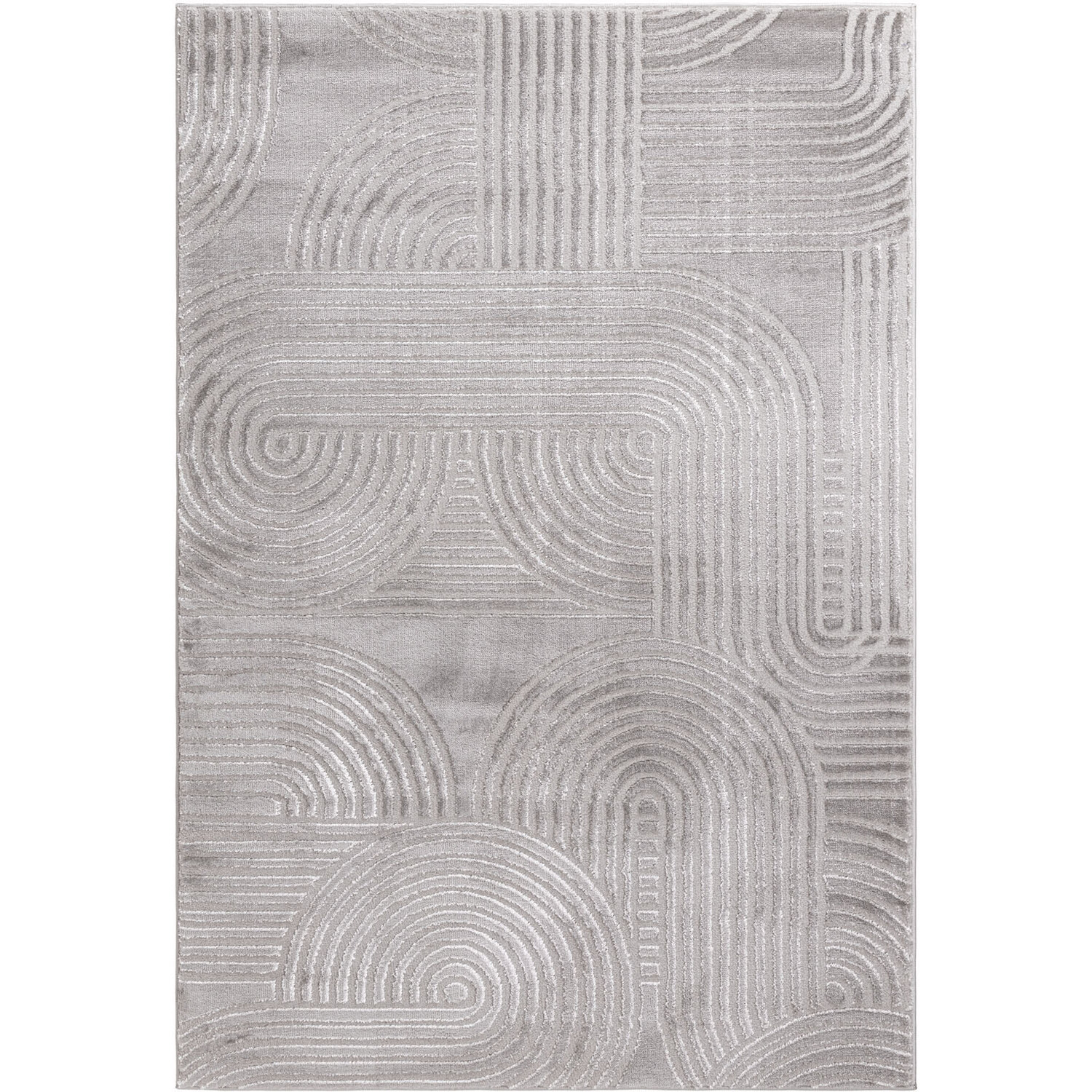 Elevate your space with the sophisticated allure of this New York-inspired rug. Its pale, powdered grey hue is subtly enlivened by ridged geometric swirls, creating a captivating Art Deco aesthetic. Metallic threads woven throughout the design add a touch of shimmering glamour, guaranteed to command attention in any room.