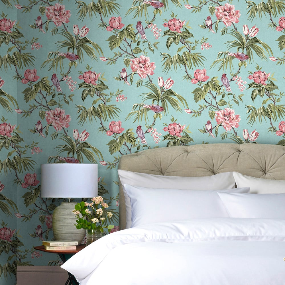 Birds and Blooms is a beautiful floral wallpaper with majestic birds perched upon branches. This gorgeous colour palette features pops of fresh greens and romantic pinks sat upon a vibrant duck egg blue ground. Printed on a matt paper this elegant design has a luxurious finish whilst also being paste the wall making this wallpaper easy to hang.