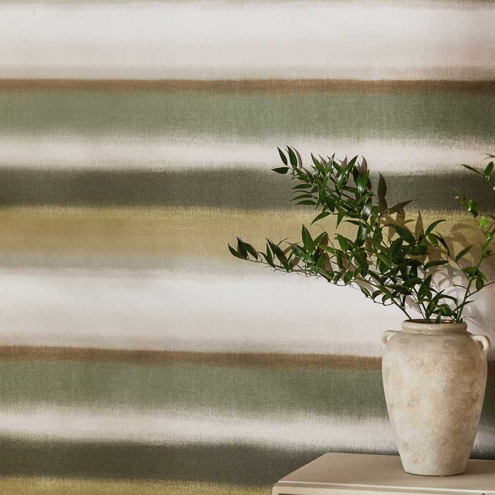 Equinox Stripe Greens displays a beautiful blend of earthy greens, beiges, browns and creams, finished with a cashmere texture effect for that soft dynamic look. This matt finish wallpaper carries effortless elegance and sophistication, whilst also creating a calm and cosy environment.