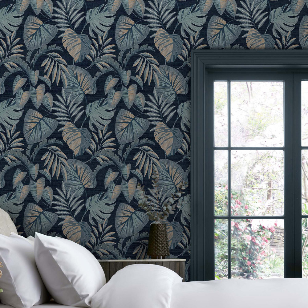Add a tropical touch to your interiors with the Jungle Leaves wallpaper. An array of tropical leaves sit upon a deep navy blue backdrop which perfectly showcases tones of duck egg, blues and soft orange creating an on trend design. Printed on matt paper this design has a contemporary finish whilst also being paste the wall making this wallpaper easy to hang.