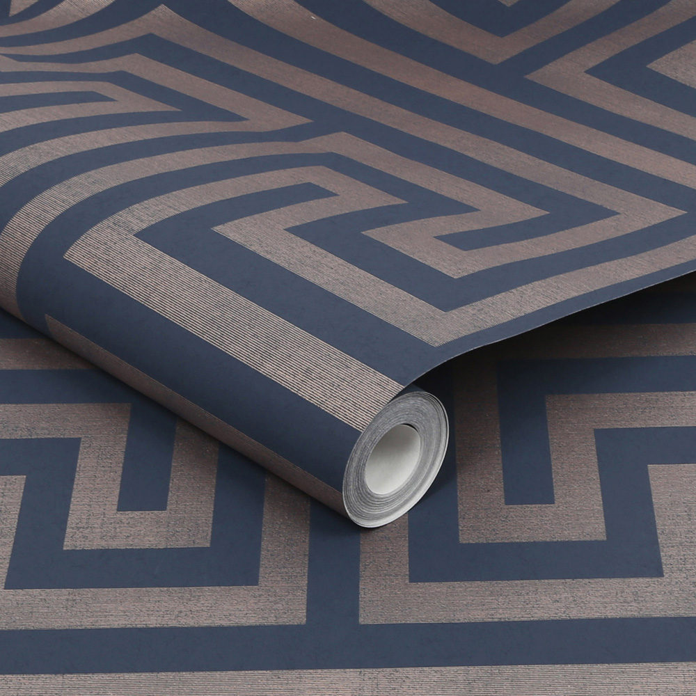 Add style and luxury to your home with the metallic Greek key wallpaper. This elegant design features a full rose gold metallic Greek key geometric perfectly sat upon a deep navy background. Adding even more luxury, this statement design is printed on a fibrous paper which adds subtle texture whilst also being paste the wall meaning easy to hang.