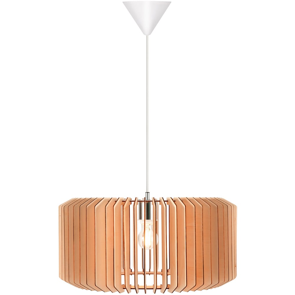 Embrace natural light and shadow with the Asti pendant. Its open wooden frame brings the outdoors in, creating a captivating interplay of light and shade. The airy design beautifully diffuses light downwards, illuminating your space with elegance. The mirrored socket and multiple slats combine to deliver a sophisticated yet understated aesthetic. Personalise your look by adding a decorative bulb of your choice.