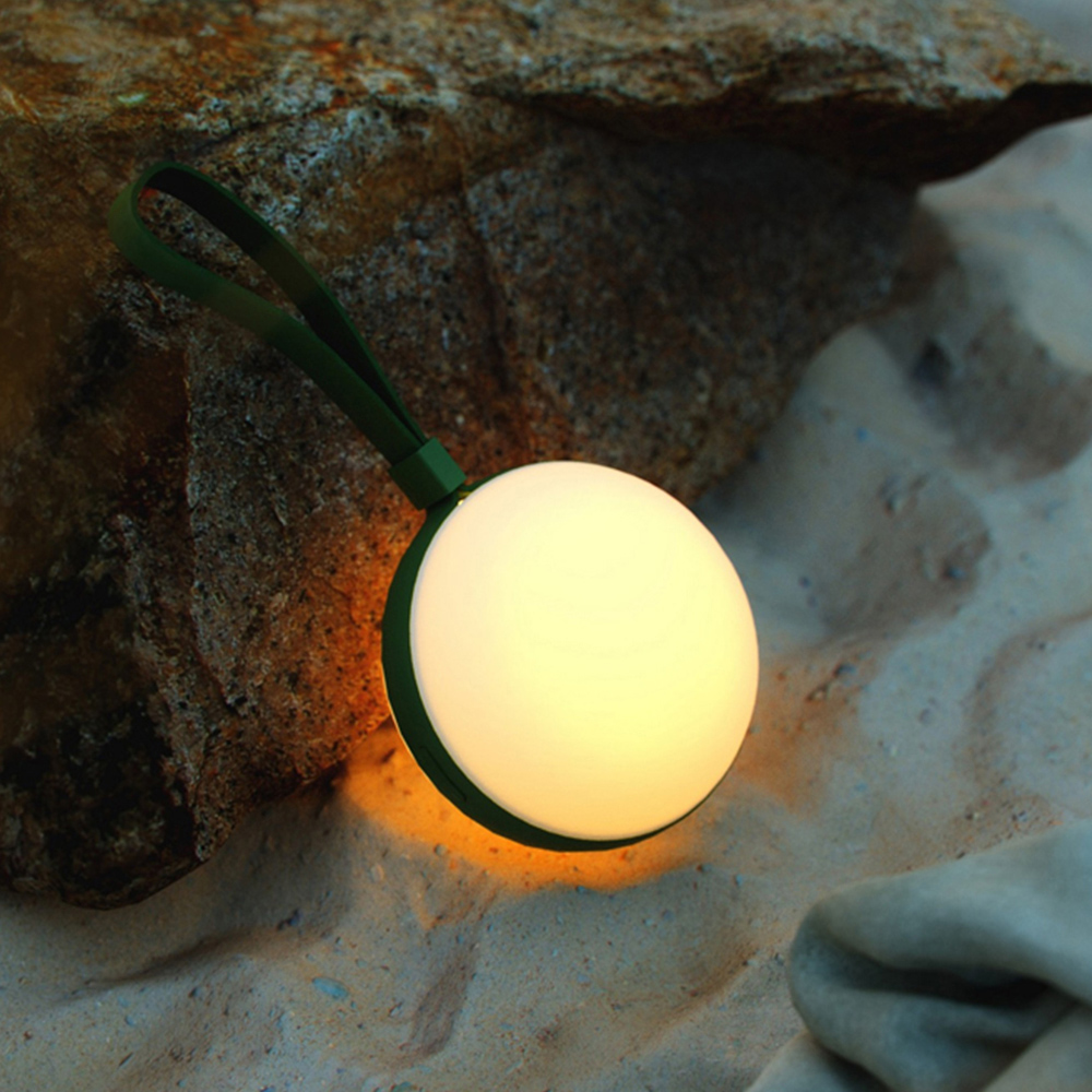 The Bring outdoor lamp offers a stylish and portable lighting solution. Its round, illuminated surface is elegantly framed by a rubber band, cleverly doubling as a handle or hanger. A simple tap activates the Moodmaker function, offering two dimming levels before switching off with another tap. Crafted from recycled materials with a water-resistant finish and boasting a long battery life, this lamp is perfect for evenings on the beach, in the park, or on your patio. Enjoy a warm and inviting ambience wherever you go. Charging is easy via the included USB cable.