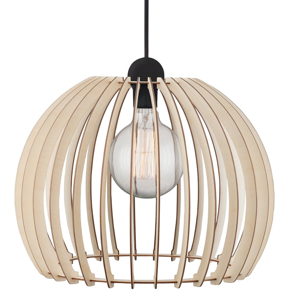 This stylish pendant light features a striking graphic design, its shade crafted from carefully arranged wooden slats to diffuse light beautifully. For an even more captivating effect, consider using a decorative lightbulb, as the bulb is visible through the slats. Perfect for illuminating a kitchen island or dining table, this statement piece adds character to any space. Please note: lightbulb not included.