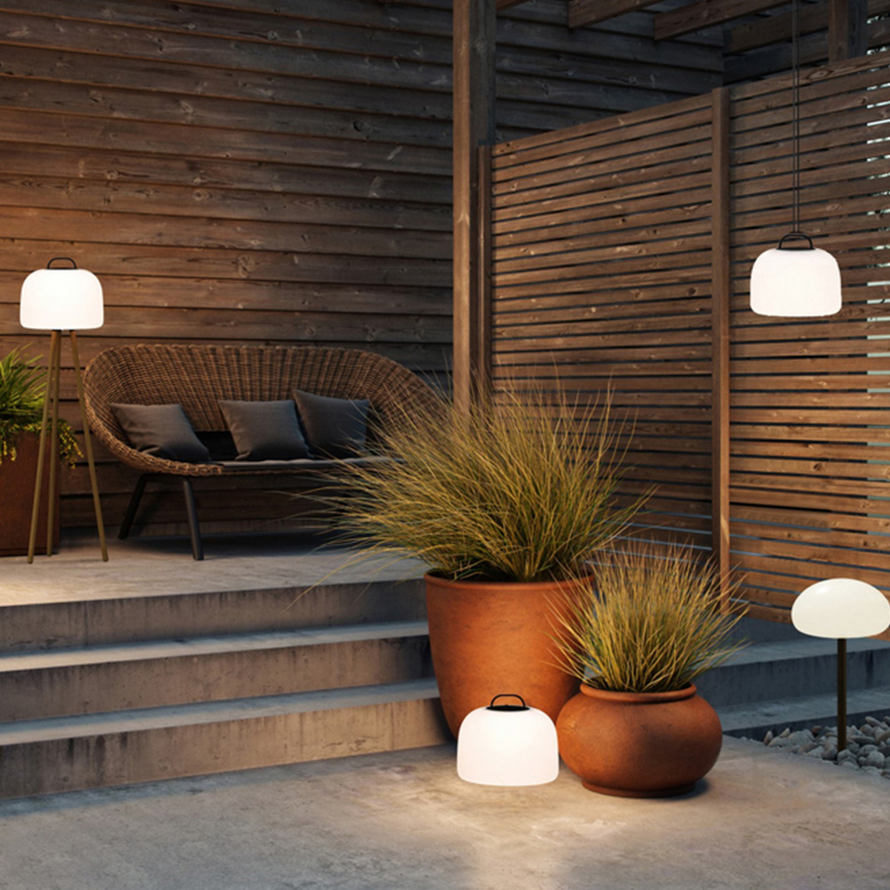 Embrace versatile illumination with the Kettle series, where interchangeable accessories let you craft the perfect lamp. Designed for both form and function, this lamp beautifully enhances your indoor and outdoor spaces. More than just a decorative piece, it casts a warm, adjustable light across three brightness levels. Enjoy up to five hours of illumination on full power, extending further on lower settings, thanks to its built-in battery. Conveniently recharge via the included USB cable. The Kettle 22's portability shines – hang it from a garden tree using the provided cord, or position it directly on a terrace, floor, or table. Enhance its adaptability with optional spike or tripod attachments, transforming it into a versatile spike, table, or floor lamp. Crafted from durable, weather-resistant hard plastic, this lamp stands strong against the elements.