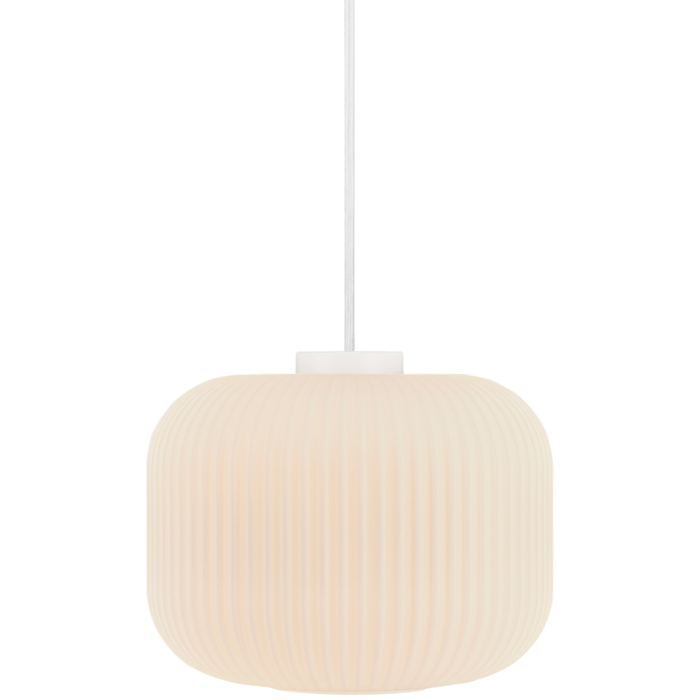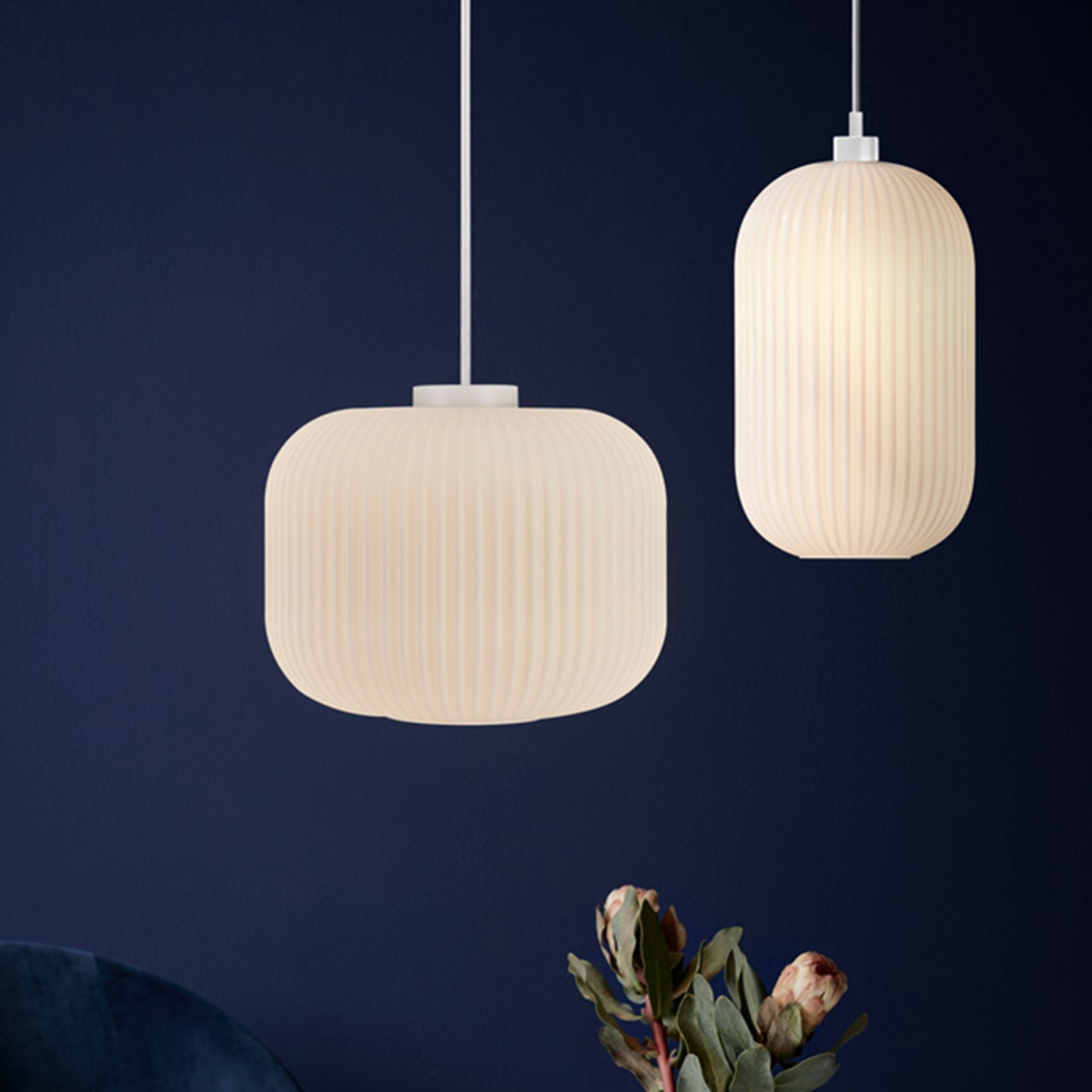 The Milford lamp collection offers a unique aesthetic. Its opal white glass, mouth-blown and individually handcrafted, casts a warm, inviting glow. The organic shapes and textured, grooved surface create an elegant design, perfect for adding a touch of sophistication to any room. Note that slight variations in glass thickness and the presence of air bubbles are inherent to the hand-blown process, adding to the lamp's distinctive character.