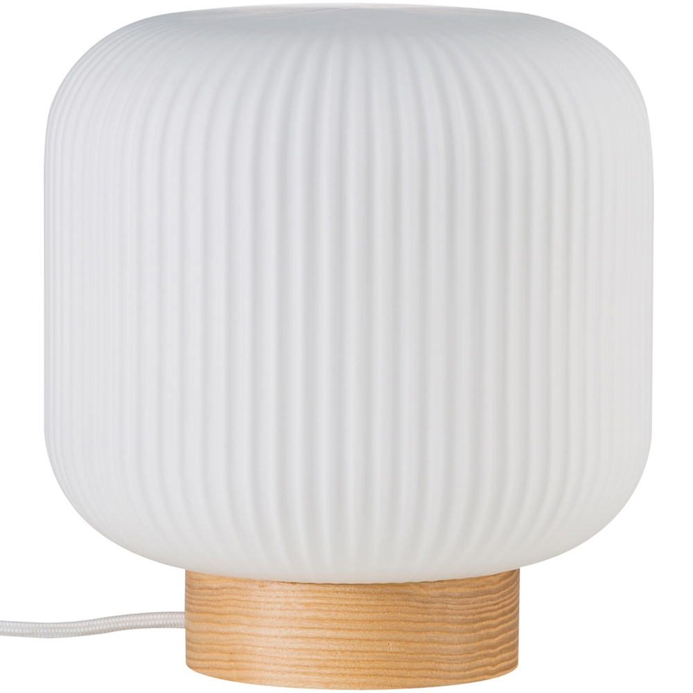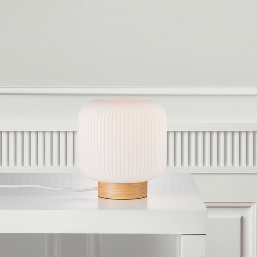 Embrace understated elegance with the Milford table lamp. Its opal white glass shade, crafted with organic forms and a grooved surface, casts a soft, warm glow, illuminating your space with subtle sophistication. The beautiful wooden base perfectly complements the Nordic design trend, bringing a touch of nature's serenity indoors. Each lamp is uniquely hand-crafted with mouth-blown glass, resulting in variations in thickness and the possibility of charming air bubbles – a testament to its individual character and artisan origins.