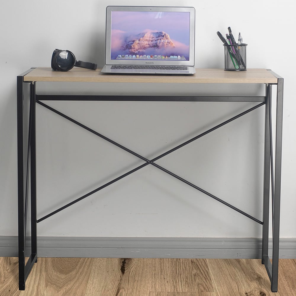 The Nova Industrial Desk offers a minimalist workspace solution with a light pine-effect tabletop, sure to complement any home office décor. Its slim black legs, featuring a crossed frame design, add a touch of sleek style. Easy to assemble, this no-fuss desk allows you to focus on the task at hand.