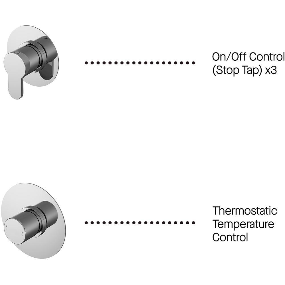 Upgrade your bathroom's versatility with the Arvan Chrome 3 Outlet Bundle, featuring stop taps. Crafted from durable brass ABS and finished in high-quality chrome, this bundle offers a flexible design, letting you customise the placement of each component to perfectly suit your space. Enjoy precise thermostatic temperature control and the convenience of a simultaneously operable hand shower.