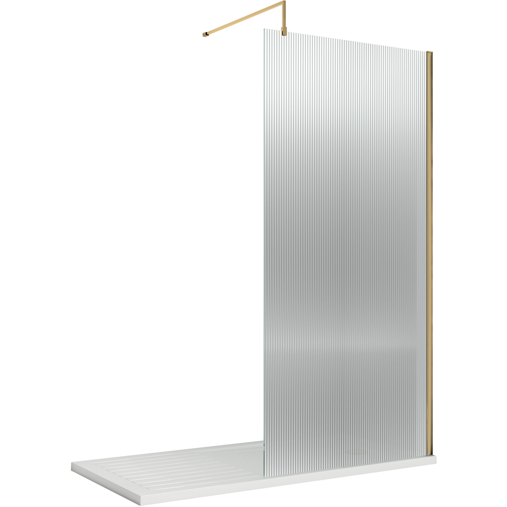 High quality wetroom screen with a brushed brass fluted design, adding Art Deco elegance to your bathroom. This 1850 x 800mm screen is crafted from 8mm toughened safety glass for durability and features a supporting bar for stability. The brushed brass finish provides a luxurious touch and enhances privacy. Includes a lifetime guarantee. Shower tray sold separately.