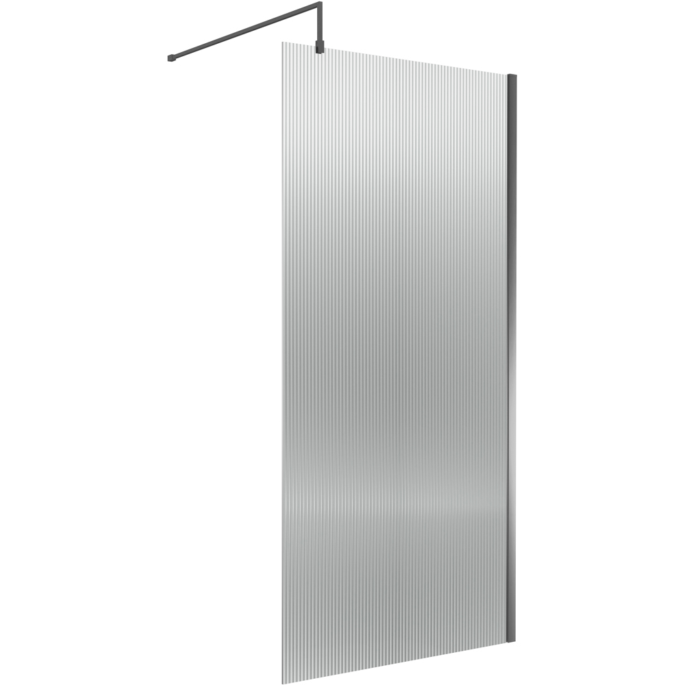 High quality contemporary wetroom screen with brushed pewter profile and fluted design. This 1850 x 1000mm screen adds Art Deco elegance and privacy to your bathroom. Crafted from 8mm toughened safety glass for durability and strength. The brushed pewter support arm provides additional stability. Includes a lifetime guarantee. Shower tray sold separately.