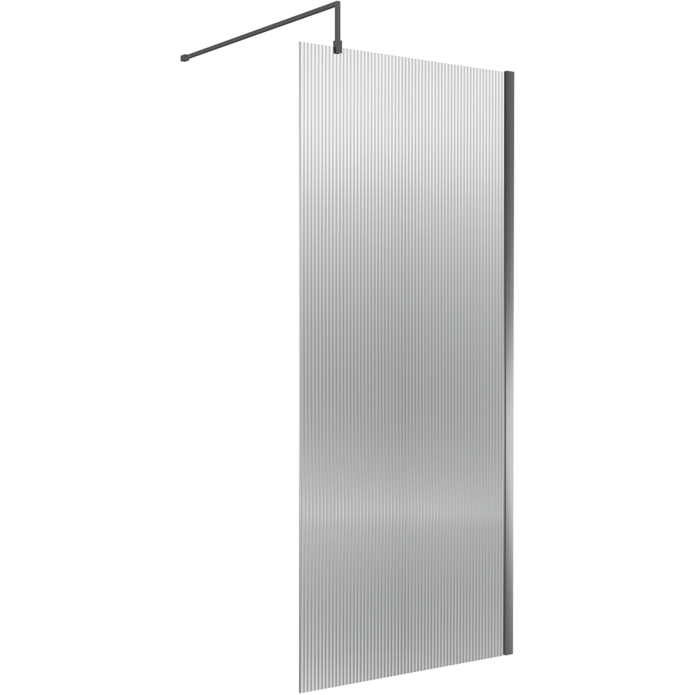 High quality contemporary wetroom screen with brushed pewter profile and fluted design. This 1850 x 900mm screen adds Art Deco elegance and privacy to your bathroom. Crafted from 8mm toughened safety glass for durability and strength. The brushed pewter support arm adds stability and complements the contemporary design. Includes a lifetime guarantee. Shower tray sold separately.