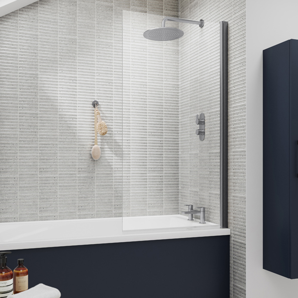 Transform your bathroom with this sleek, brushed pewter square bath screen (785mm). Create a dedicated showering area within your bath, maximizing space. Its reversible design ensures a perfect fit for your specific needs. Crafted from 6mm toughened safety glass, this screen is ideal for straight baths. Dimensions: 1430 x 785 x 38mm.