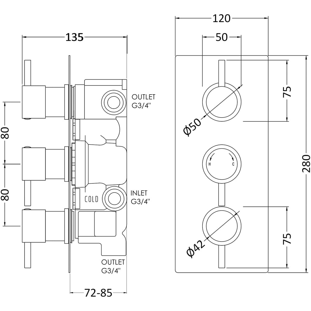 Upgrade your showering experience with the nuie Chrome Triple Thermostatic Shower Valve with Diverter. This versatile valve offers flexible installation, fitting both vertically and horizontally to suit your bathroom layout. Enjoy precise temperature control, accurate to within +/- 2 degrees, ensuring a consistent shower even with fluctuating water pressure. Built from durable brass and ABS, this valve is designed for long-lasting reliability. Complete with full thermal protection, it automatically shuts off to prevent scalding should the hot or cold water supply be interrupted, meeting all relevant safety standards. The unique cartridge resists limescale build-up, making it perfect for hard water areas. Compatible with all systems – gravity-fed, pumped, unvented high-pressure, or combi-boilers – it delivers excellent flow rates even at low pressure. And, for added convenience, the cartridge is easily reversible, simply remove, rotate 180°, and refit should your hot and cold water supplies be reversed.
