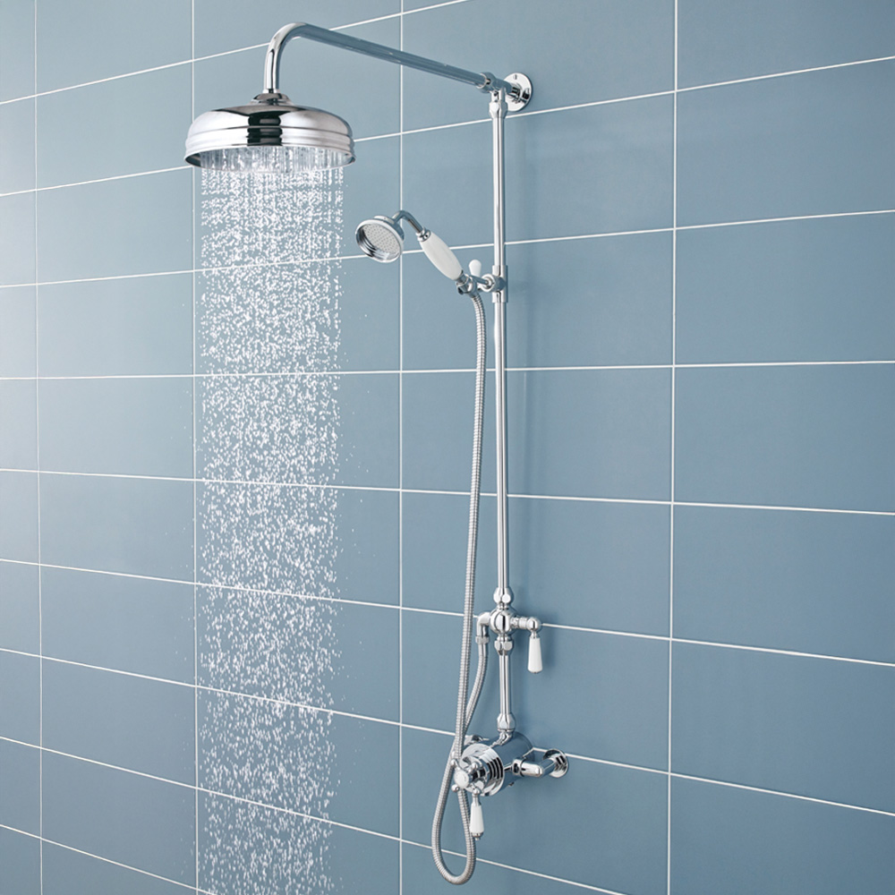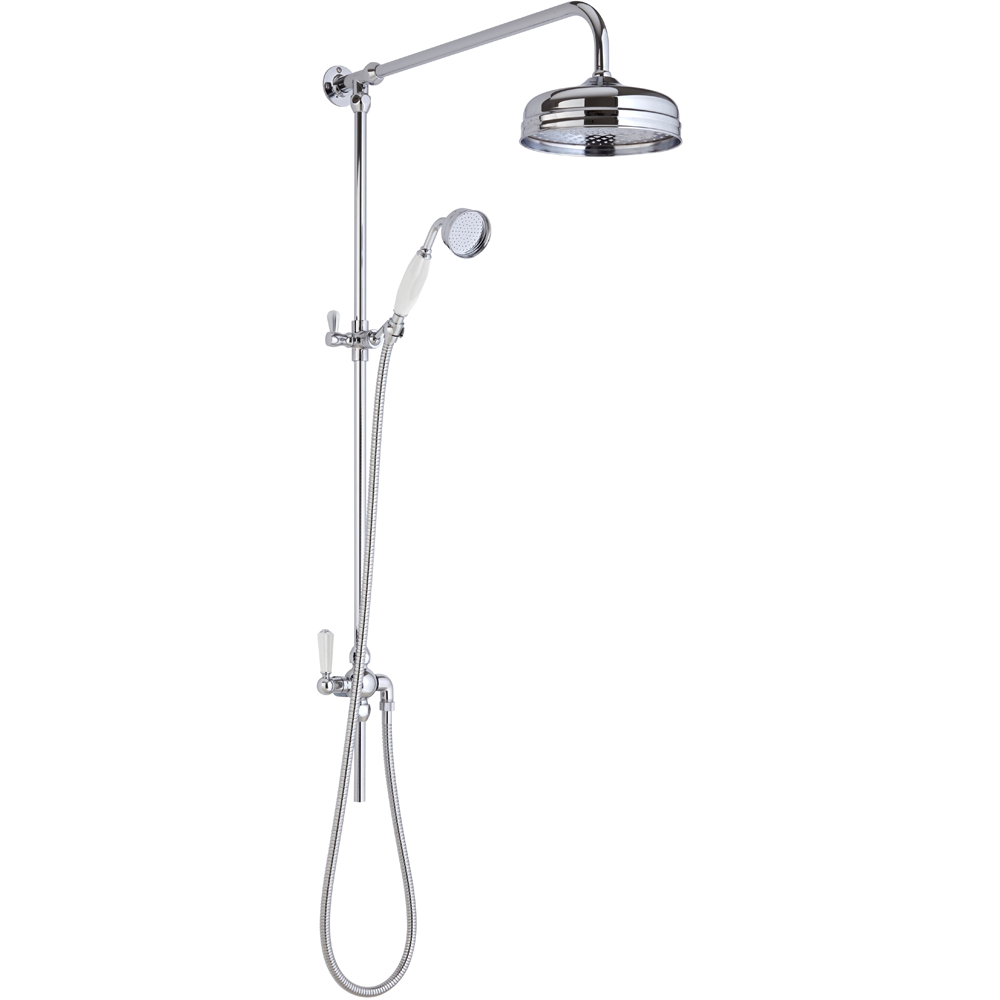 Elevate your bathroom',s aesthetic with this chrome and white rigid riser shower kit. Its timeless design seamlessly blends functionality with classic style, creating a sophisticated showering experience. The versatile kit includes a round showerhead and a convenient handset, offering showering flexibility to suit individual preferences. A built-in diverter effortlessly switches between the showerhead and handset. Designed for exposed shower valves, this kit ensures compatibility with a variety of installations, making it a perfect choice for completing your traditional bathroom look.