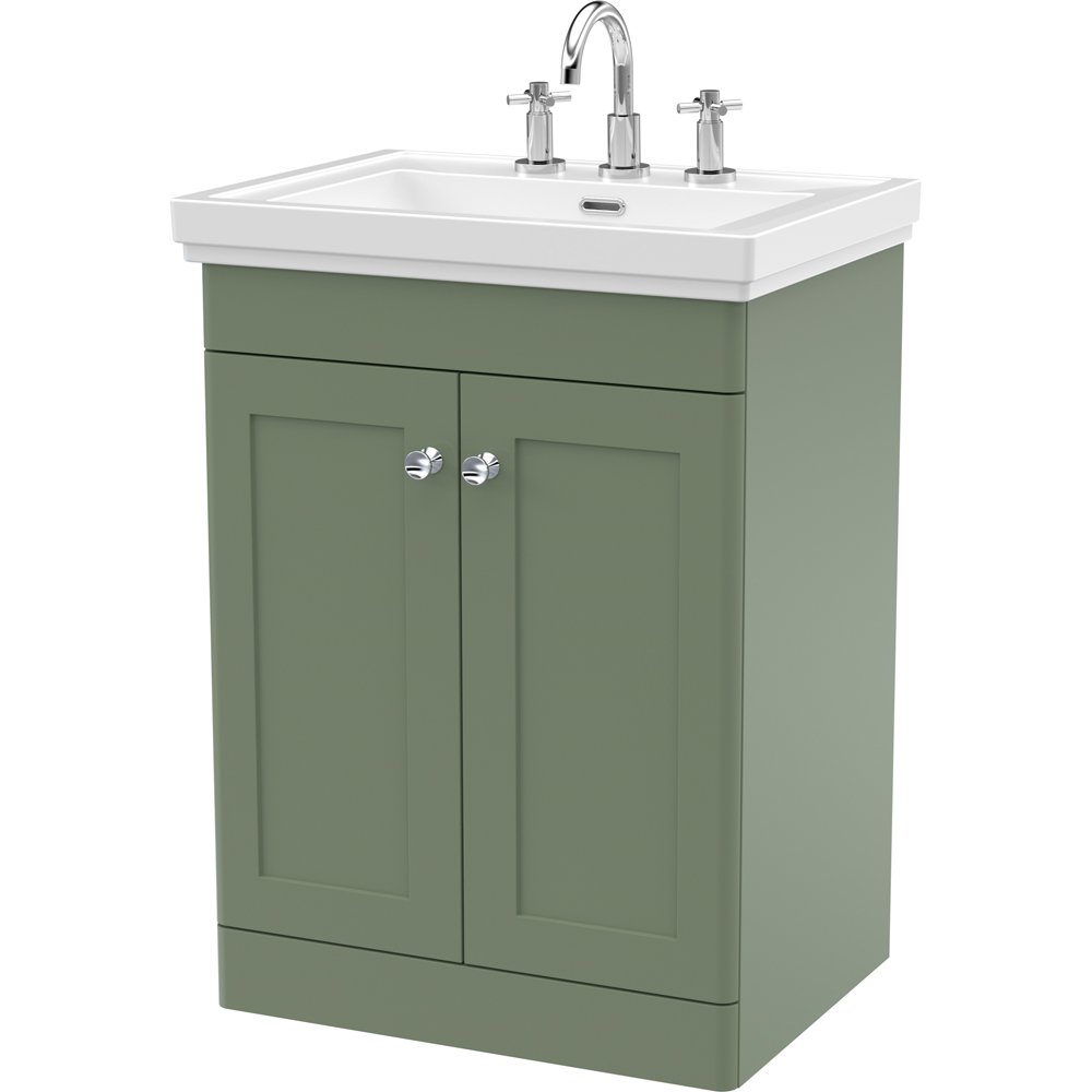 nuie Classique 2 Door Satin Green Floor Standing Vanity Unit and 3 Tap Hole Fireclay Basin 600mm