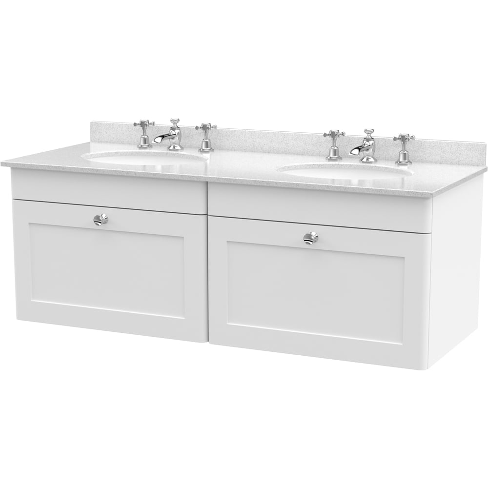 nuie Classique 2 Drawer Satin White Wall Hung Unit and 3 Tap Hole Marble Basin 1200mm