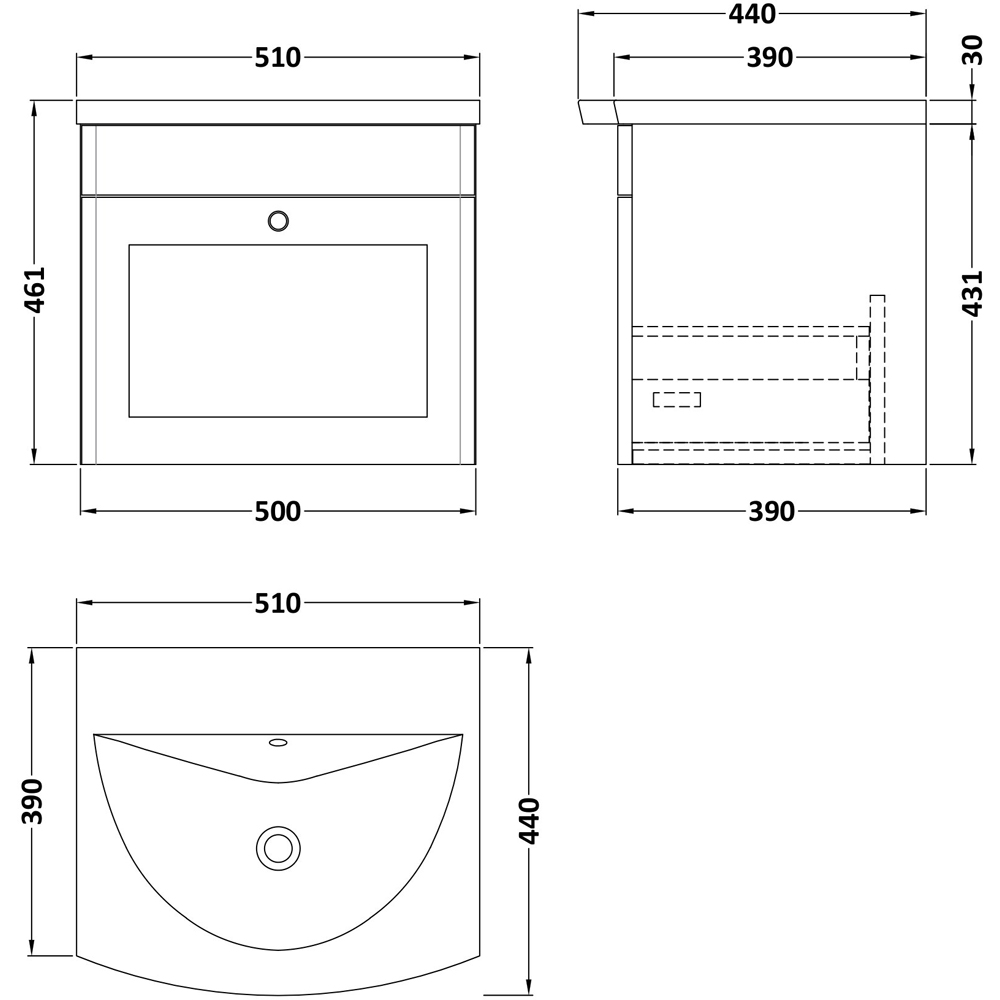 Upgrade your bathroom with this sleek, wall-hung 500mm Classique Single Drawer unit in sophisticated satin grey. The curved basin features a single tap hole for a clean, contemporary look, and an integrated drawer with a sleek handle provides convenient storage. This high-quality unit effortlessly enhances any bathroom.