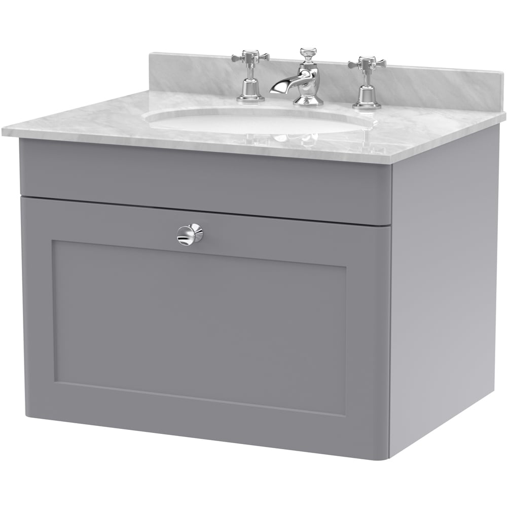 nuie Classique Single Drawer Satin Grey Wall Hung Unit and 3 Tap Hole Marble Basin 600mm