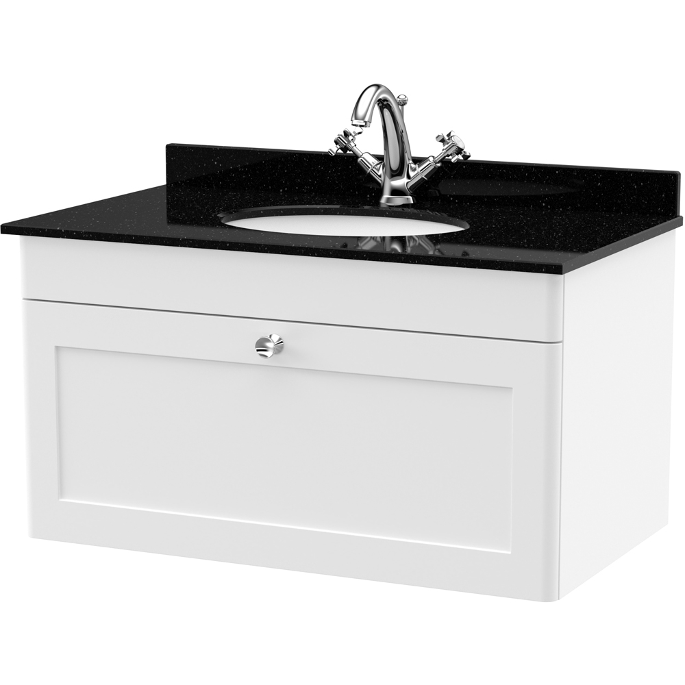 nuie Classique Single Drawer Satin White and Black Wall Hung Unit and 1 Tap Hole Marble Basin 800mm