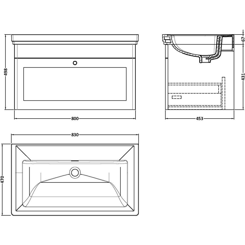 nuie Classique Single Drawer Satin White Wall Hung Unit and 0 Tap Hole Fireclay Basin 800mm