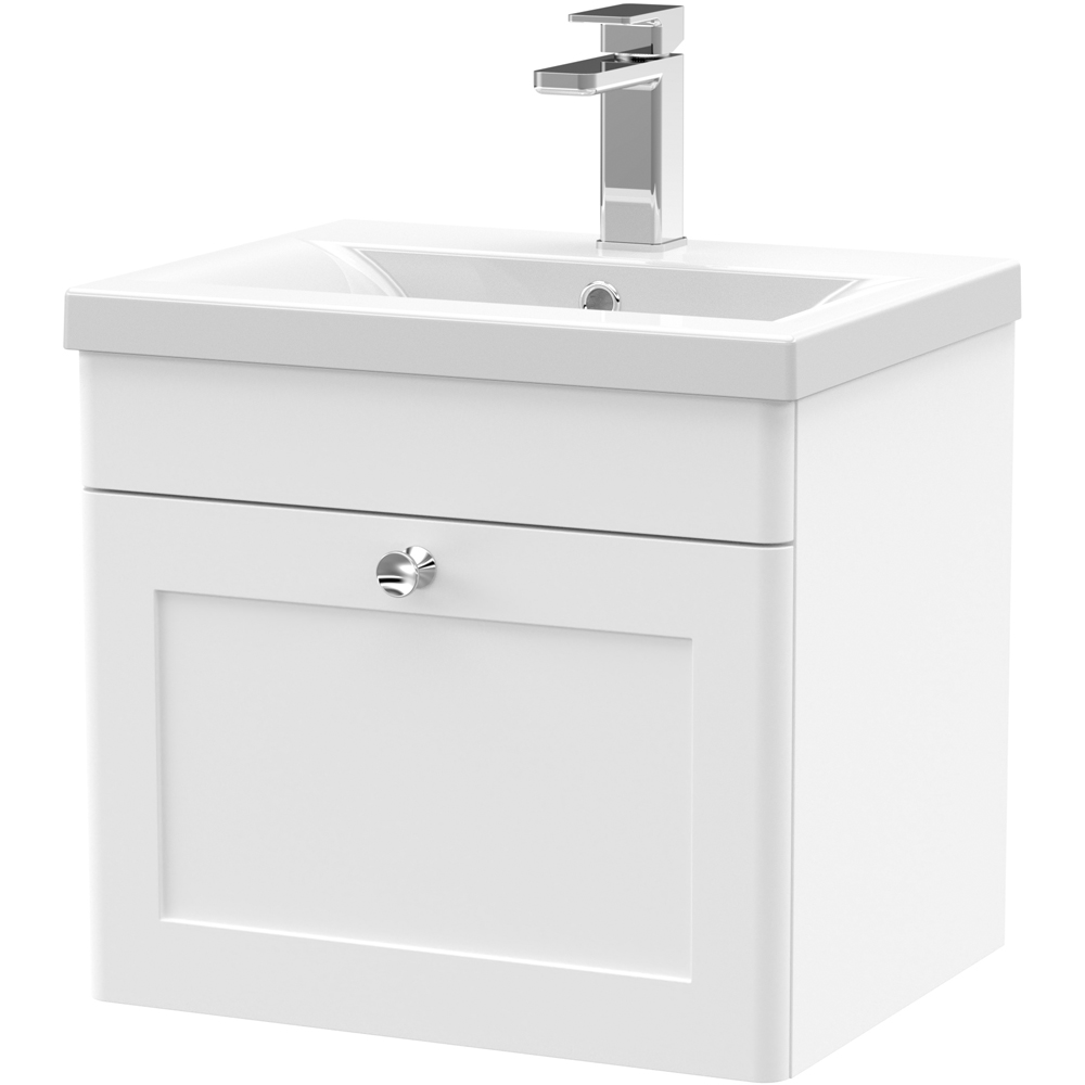 nuie Classique Single Drawer Satin White Wall Hung Unit and Mid-Edge Ceramic Basin 500mm