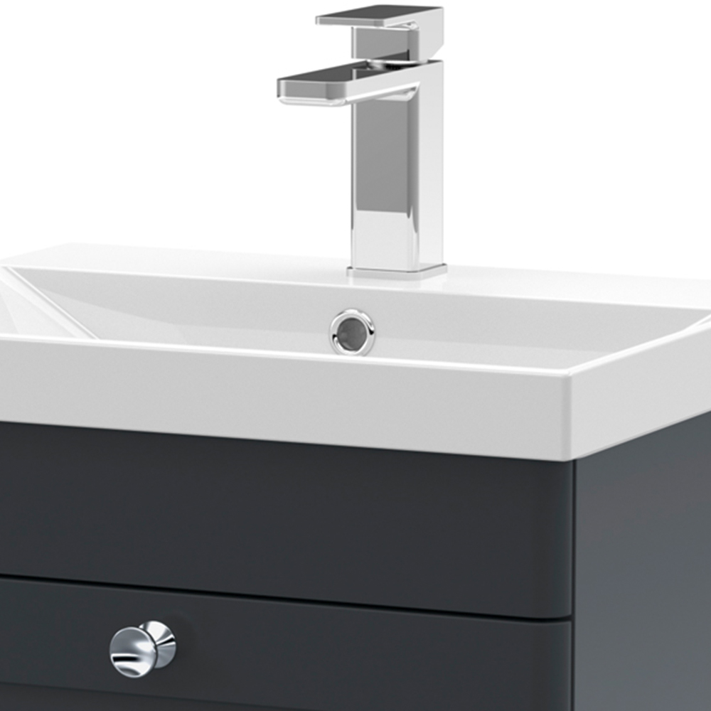 The nuie Classique Single Drawer vanity unit in soft black boasts a contemporary take on vintage style. Soft-close drawers offer quiet operation and durability, complemented by sleek chrome handles. This 500mm wall-hung unit includes a high-quality ceramic basin and provides ample storage. Enjoy peace of mind with our five-year guarantee. Dimensions: 481 x 510 x 395mm.