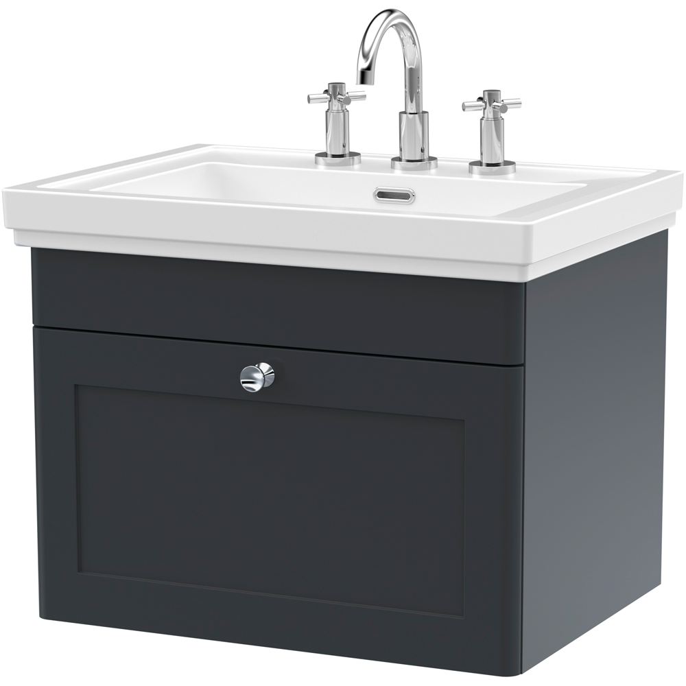 nuie Classique Single Drawer Soft Black Wall Hung Vanity Unit and 3 Tap Hole Fireclay Basin 600mm