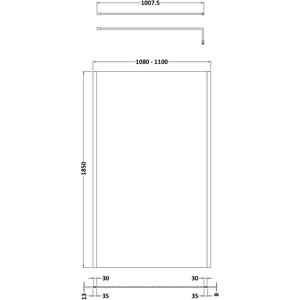 nuie Matt Black Outer Framed Wetroom Screen with Support Bar 1850 x 1100mm