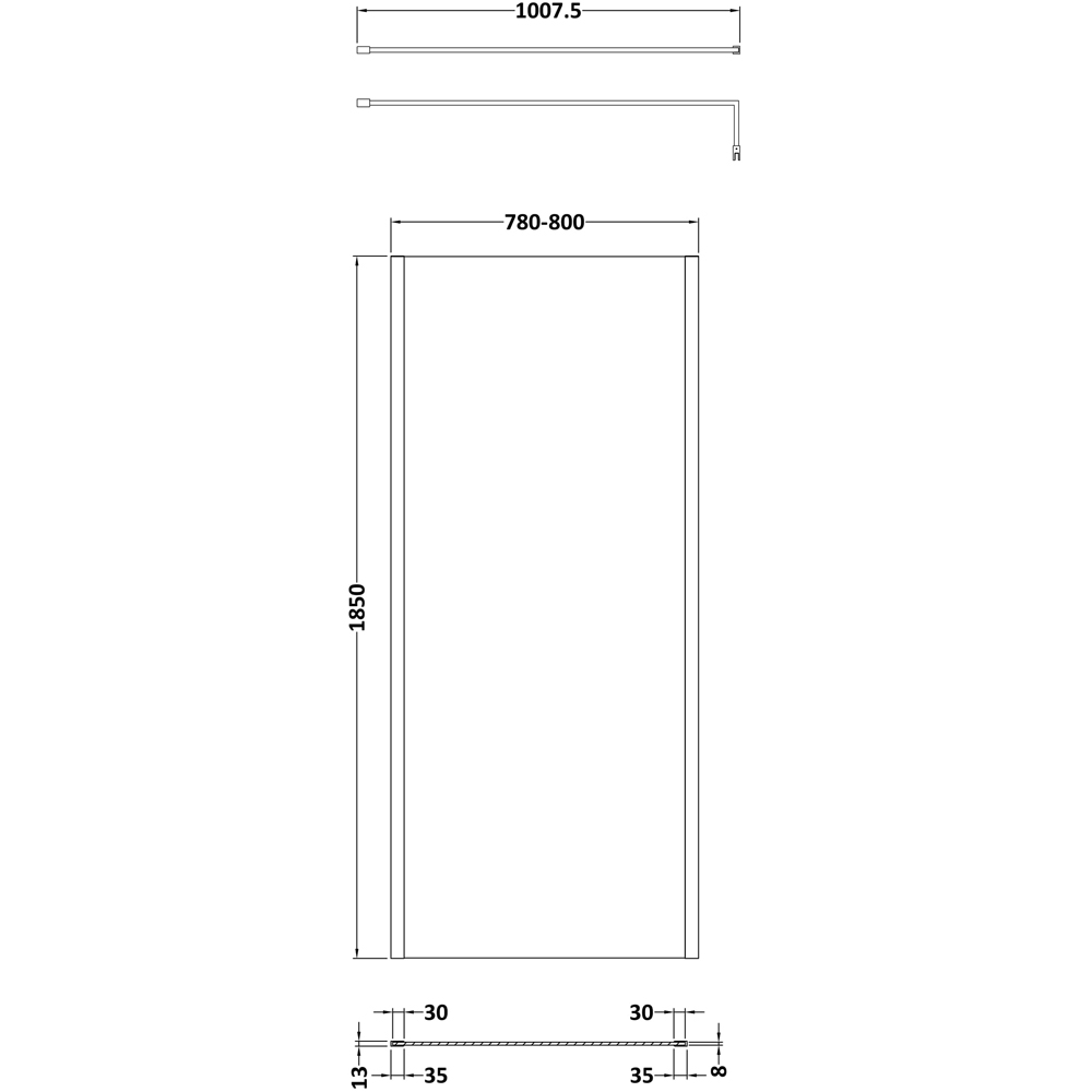 nuie Matt Black Outer Framed Wetroom Screen with Support Bar 1850 x 800mm
