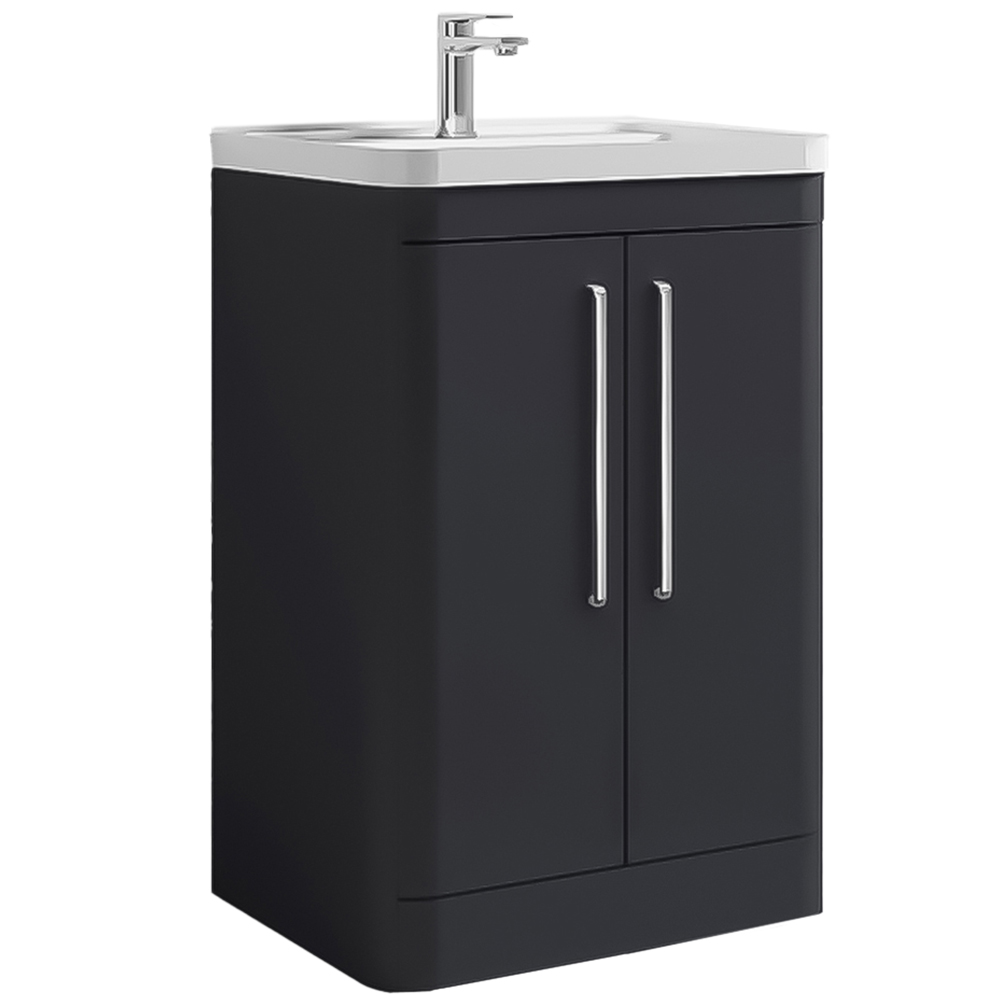 Contemporary floor-standing vanity unit with ample storage, ideal for busy family homes. The soft black finish adds a sophisticated touch to any bathroom décor. Soft-close doors minimise noise and wear, ensuring a peaceful atmosphere. Includes a high-quality polymarble basin with a single tap hole. Supplied rigid for easy installation and backed by a five-year guarantee. The unit measures 600mm.