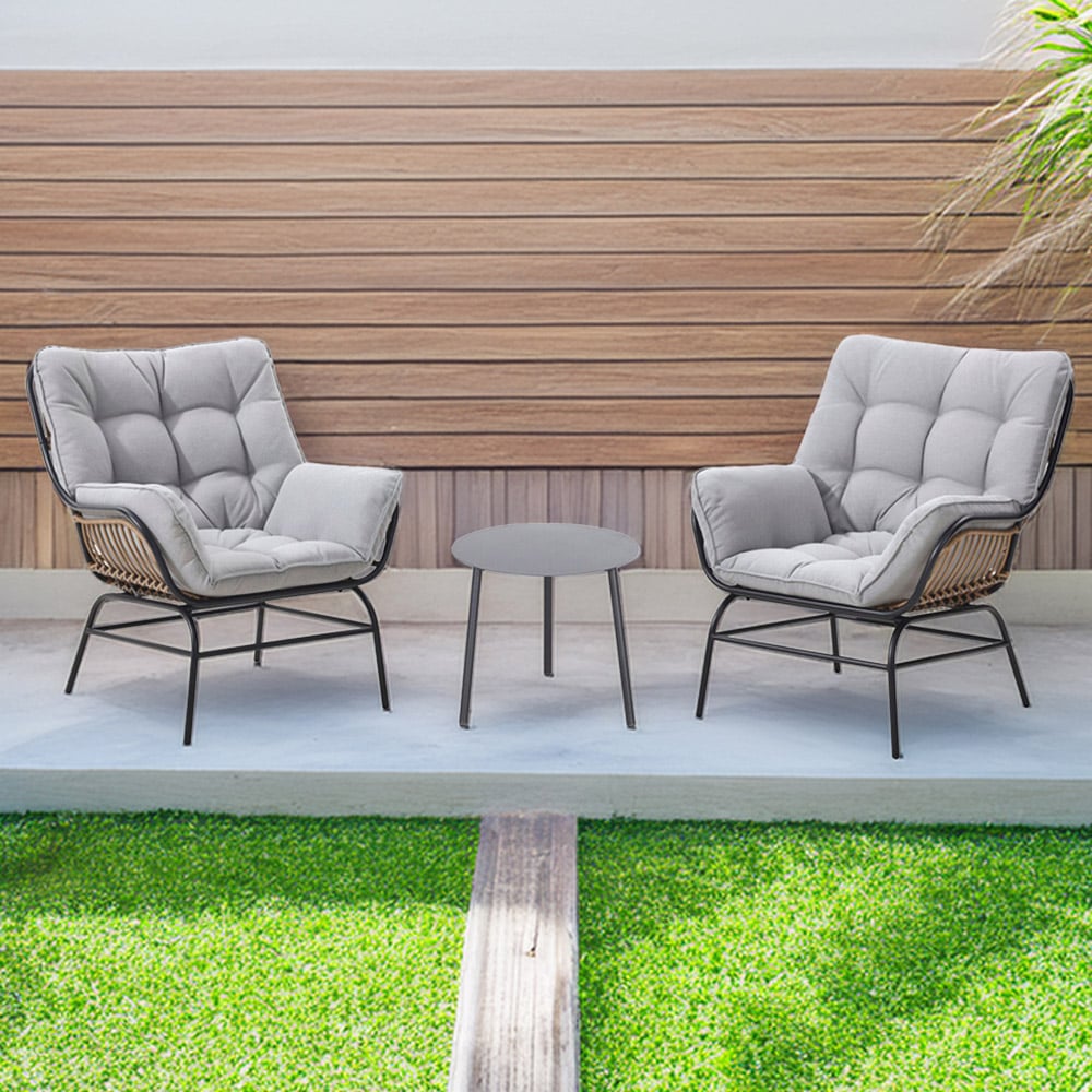 Elevate your outdoor living space with the Odette Natural 2 Seater Patio Bistro Set with Cushions. It is designed to bring both elegance and practicality to your patio, balcony, or garden nook. Built with a rust-resistant powder-coated steel frame, this set offers resilience against the elements. The weather-resistant natural rattan weave adds a stylish texture while standing up to the sun and rain with ease. Complemented by thick, generously padded cushions, the chairs deliver exceptional comfort, making it easy to relax outdoors for hours. The matching table provides the perfect spot for drinks, snacks, or a good book.
