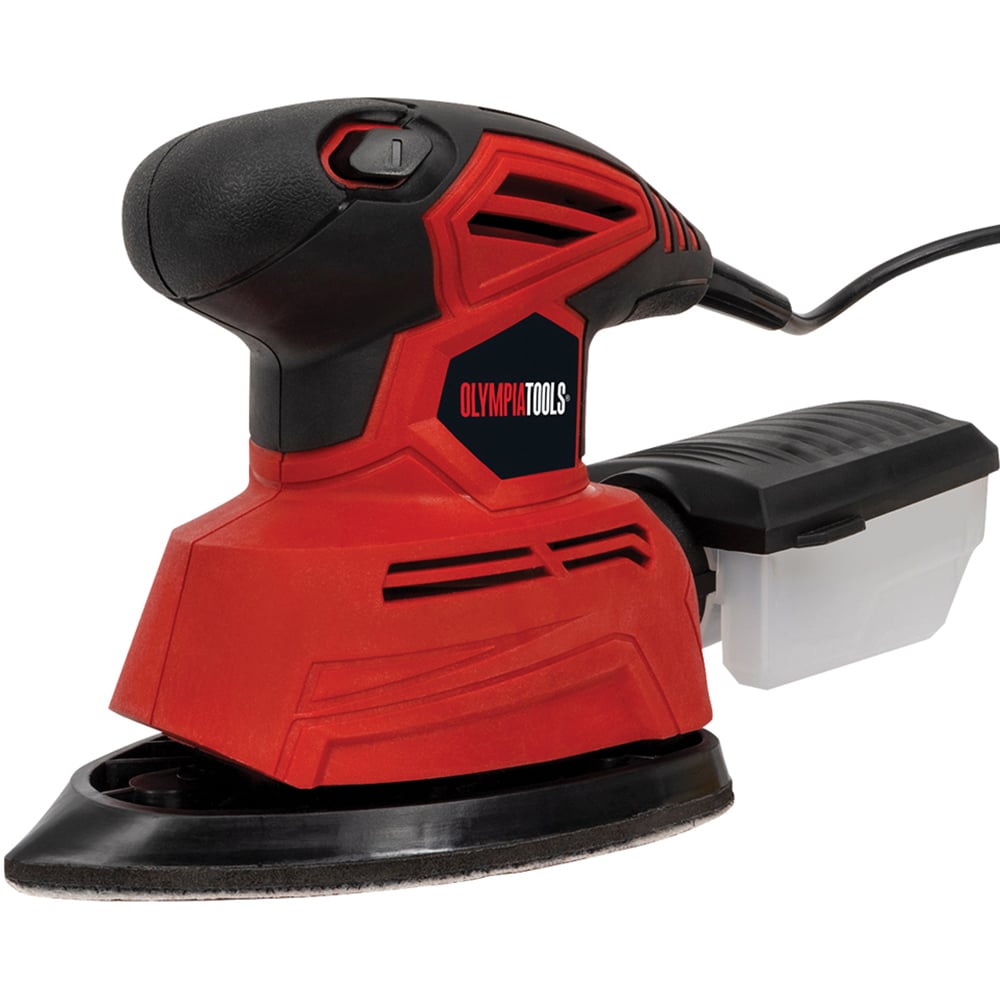 Effortlessly smooth surfaces with the Olympia Power Tools Multi-Sander. This 240V, 130W sander tackles various sanding tasks with its powerful motor. The hook and loop system makes changing the sandpaper quick and easy. Its ergonomic soft grip handle ensures comfortable extended use. The integrated dust collection box keeps your workspace clean. Includes three sanding sheets and a removable dust box. Perfect for DIY enthusiasts, this sander boasts an oscillating speed of 14,000/min and a 1.6mm orbit diameter. Sandpaper size is 140 x 140 x 80mm, and the sander weighs just 1.46kg.