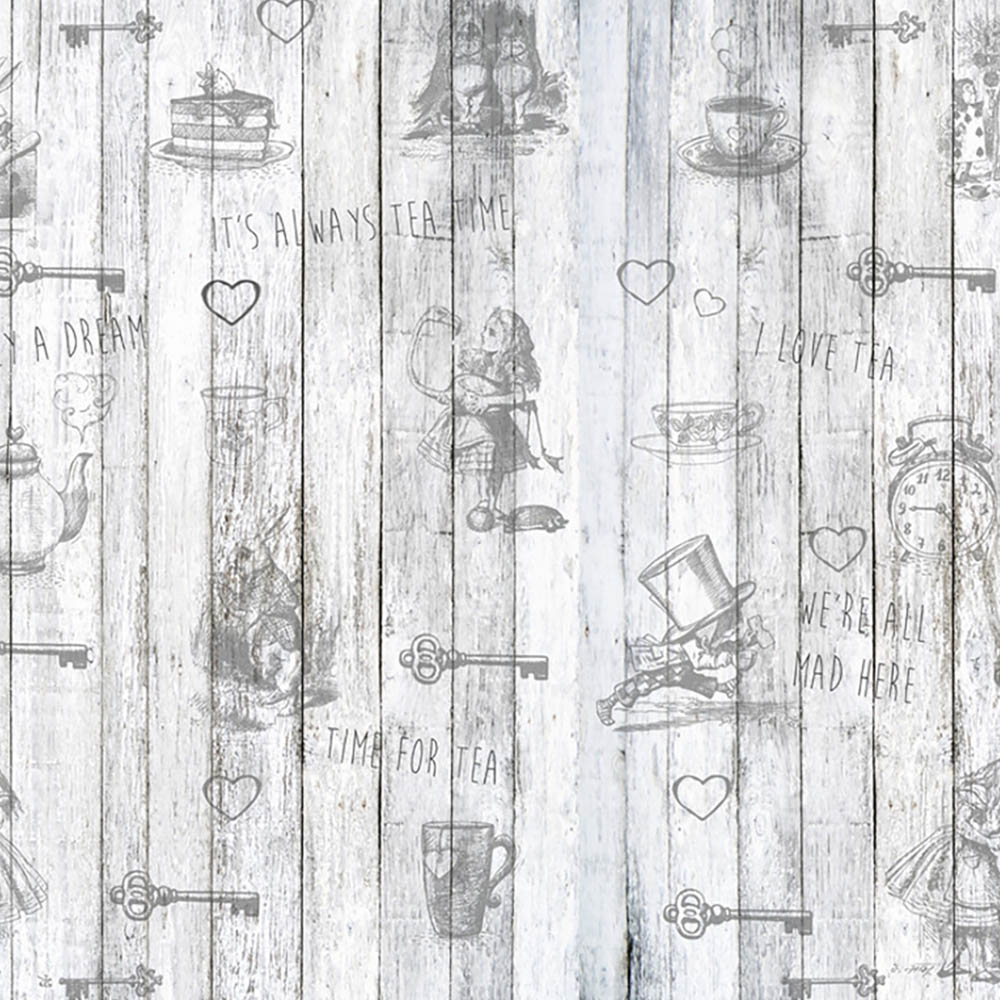 This charming wallpaper design offers a contemporary twist on a classic English rose motif. Retro polka dots form a delightful backdrop for whimsical Alice in Wonderland-inspired illustrations peeking playfully amongst charming floral details. This design injects personality and a touch of whimsy into any room.