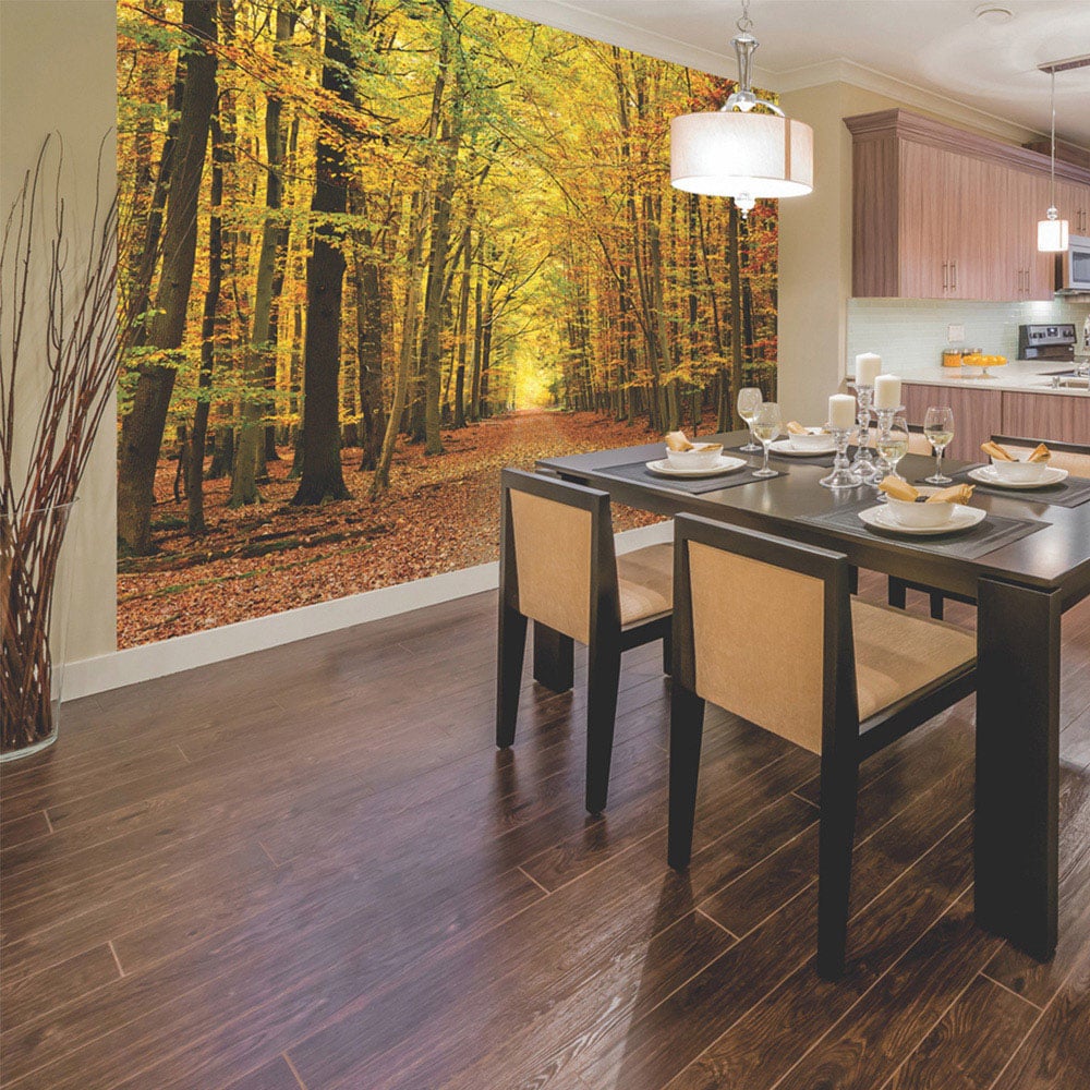 Transform your home with the Autumn Forest Orange Wall Mural, a captivating design showcasing a serene forest path bathed in rich russet, ochre, and amber hues. This stunning mural, bursting with warm autumnal colours, is printed on a single roll for effortless application. Complete with clear cutting guidelines and hanging instructions, this paste-the-wall mural is a simple yet impactful way to update your living space.