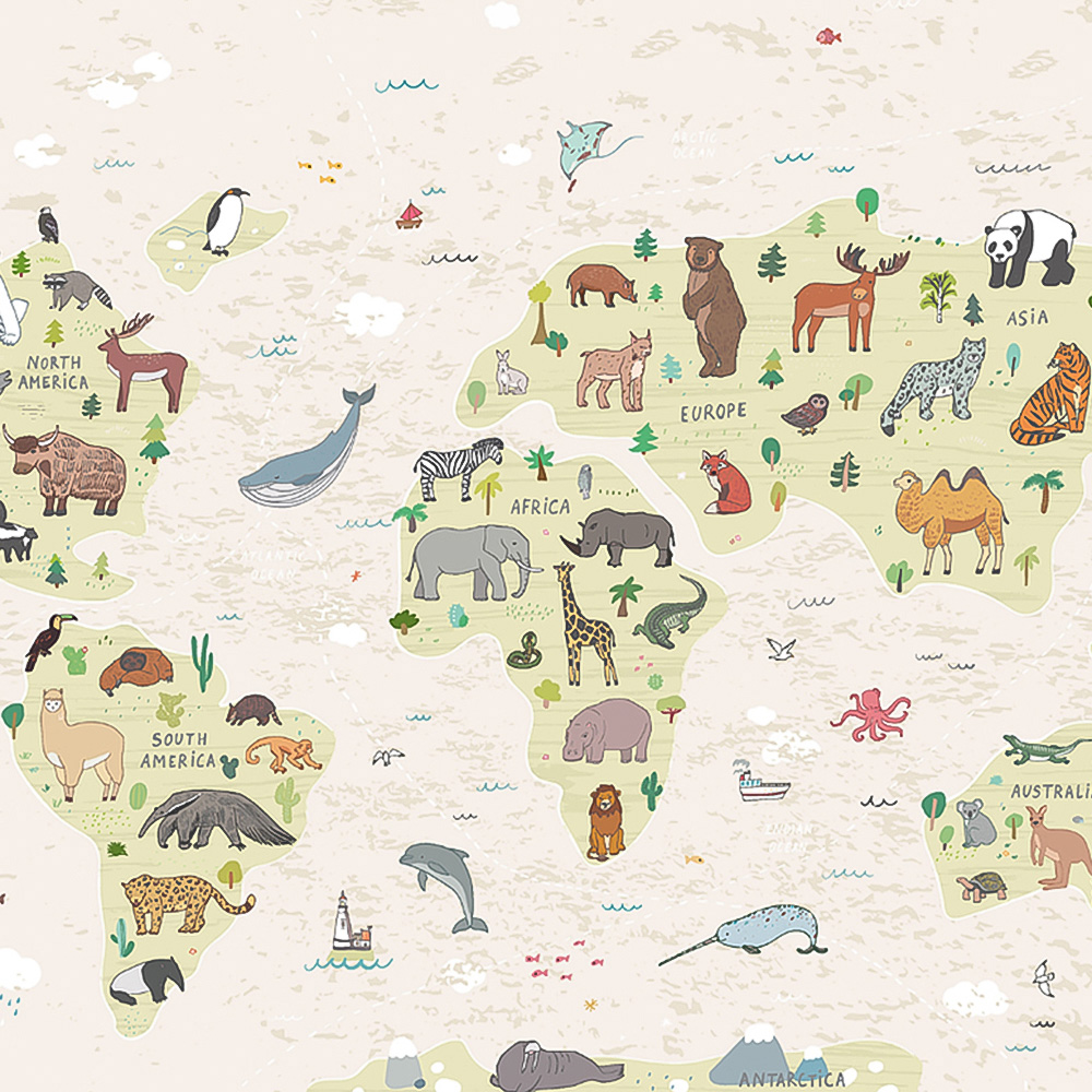 Bring the wonder of the world's wildlife into your home with this captivating mural. Charming animal illustrations from across the globe are delightfully interspersed with tiny boats, playful waves, enchanting sea creatures, and lush trees, creating a scene that spans both land and sea. A truly captivating design, it's both visually stunning and subtly educational.