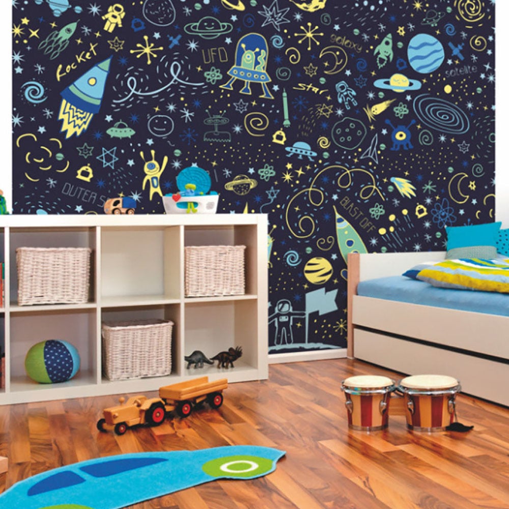 Transform your walls with this vibrant football mural. Bold doodles of footballs, boots, and goal nets, interspersed with lightning bolts and football-themed phrases, create a dynamic and eye-catching design perfect for any fan. A striking addition to any room.