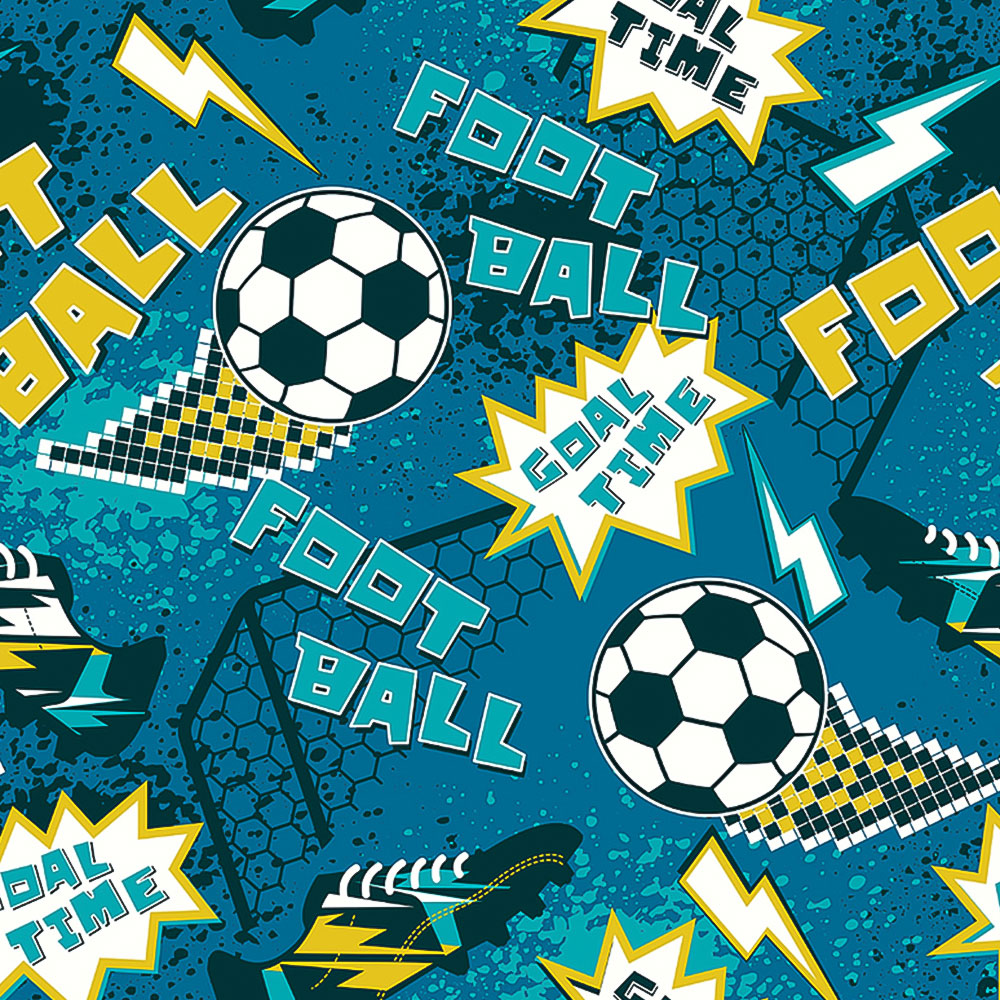 Bring the thrill of the game into your home with this dynamic football mural. Bold doodles of footballs, boots, and goal nets, interspersed with lightning bolts and football-themed phrases, create a striking design perfect for any fan. This vibrant mural makes a real statement, adding personality and energy to any room.
