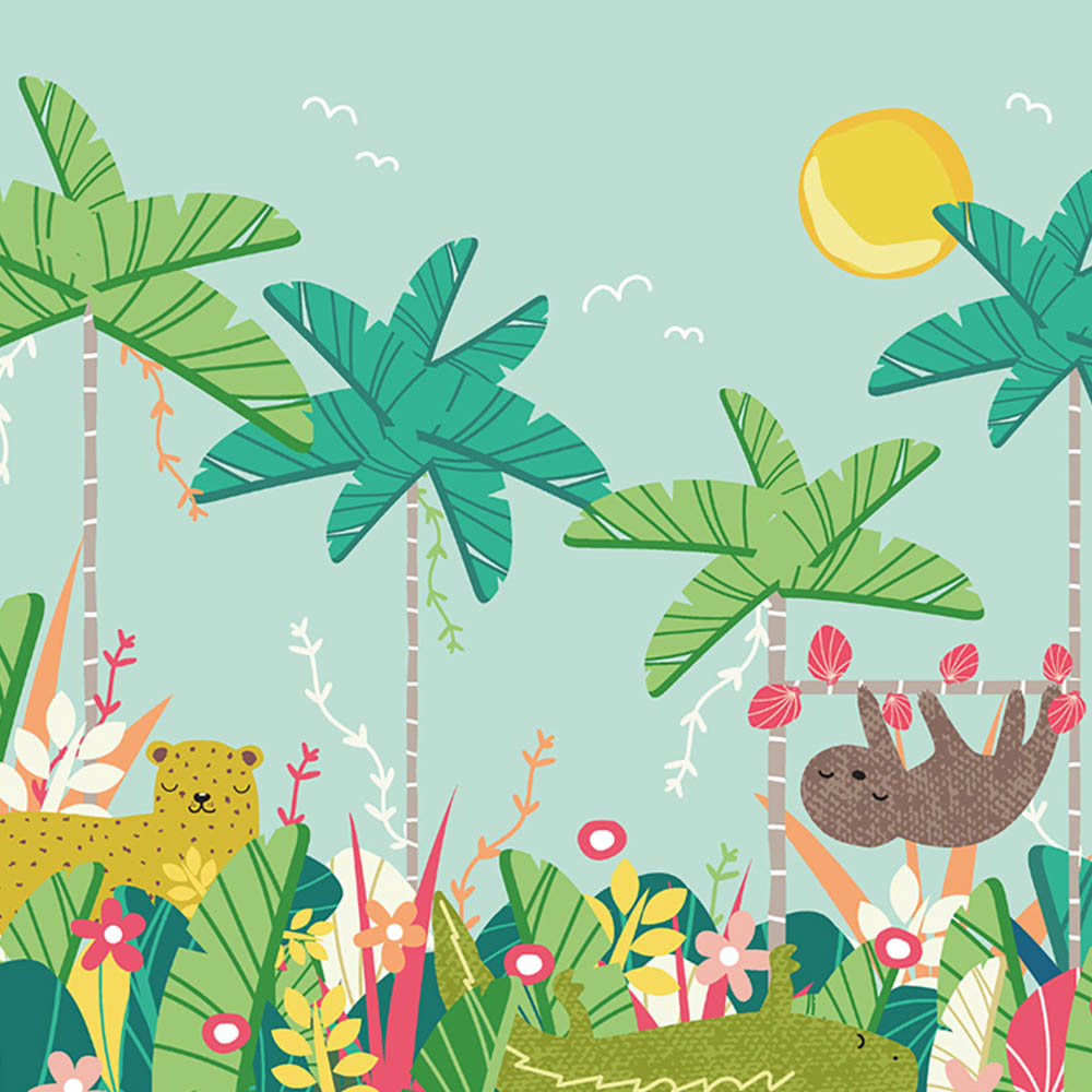 Bring the jungle home with this vibrant children's wall mural. Featuring a leopard, crocodile, and sloth nestled amongst lush, graphic flowers, vines, and trees, this design creates a cheerful, shaded jungle scene perfect for bedrooms or play areas.