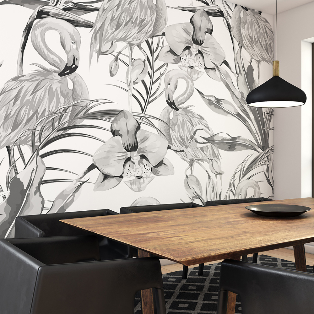 Transform your space with this vibrant tropical scene wallpaper mural. Bring the lush beauty of a paradise to your walls, featuring painterly palm leaves, fluffy flamingos, and delicate watercolour orchids. Bird of paradise flowers add height and texture, creating a layered, artistic effect. This striking design is perfect for adding a personal touch to any room, breathing life and vibrancy into your living space.