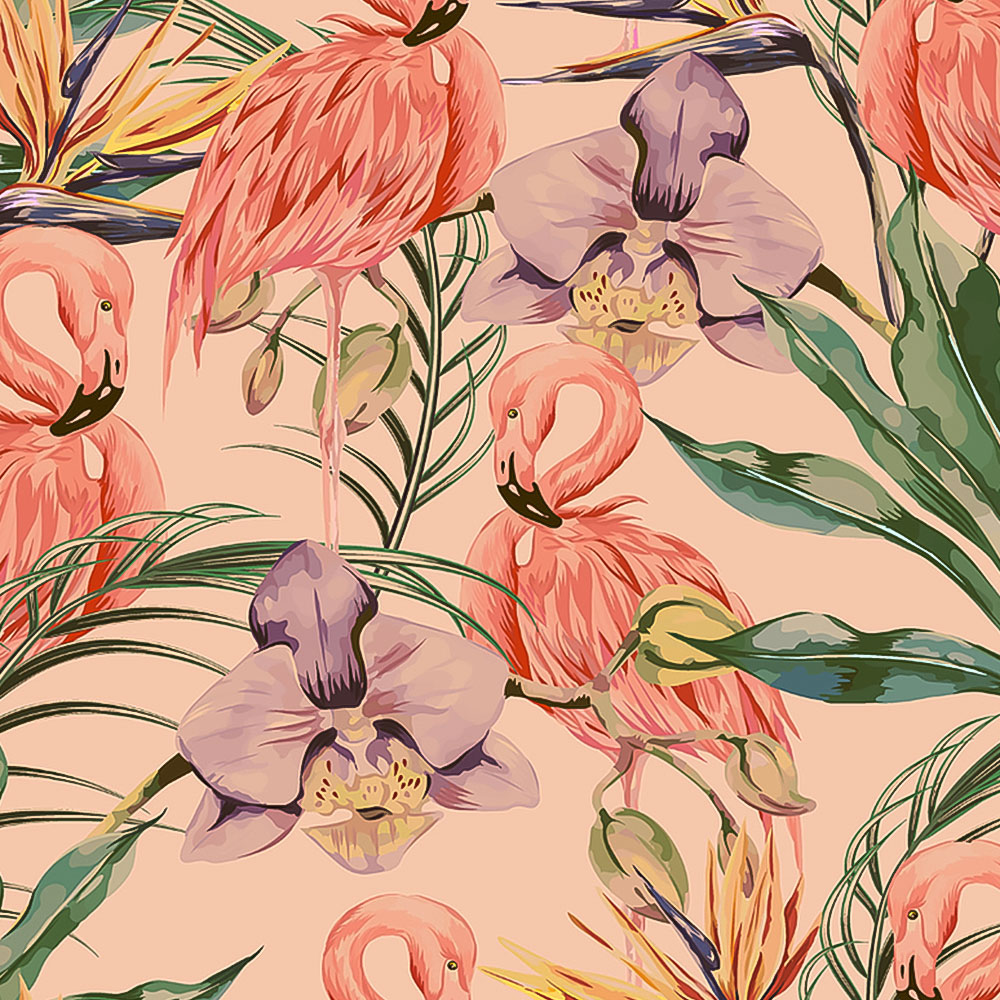 Transform your space with this vibrant tropical scene wallpaper. Abundant wildlife thrives amongst painterly palm leaves, showcasing fluffy flamingos and delicate watercolour orchids. Bird of paradise flowers add height and texture, creating a layered, visually rich design. This mural brings the lush beauty of the tropics indoors, adding a striking and personal touch to any room. Perfect for bedrooms or living areas, it',s a visual storey you',ll enjoy every day.