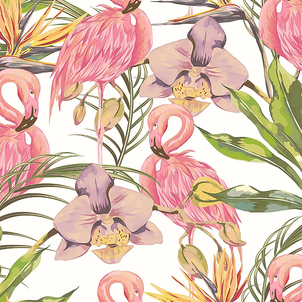 This vibrant wallpaper design brings the tropics to your home. Flamingoes and orchids share the scene amongst painterly palm leaves, while bird of paradise flowers add height and textured layering to the design. Perfect for a feature wall or complete room coverage.