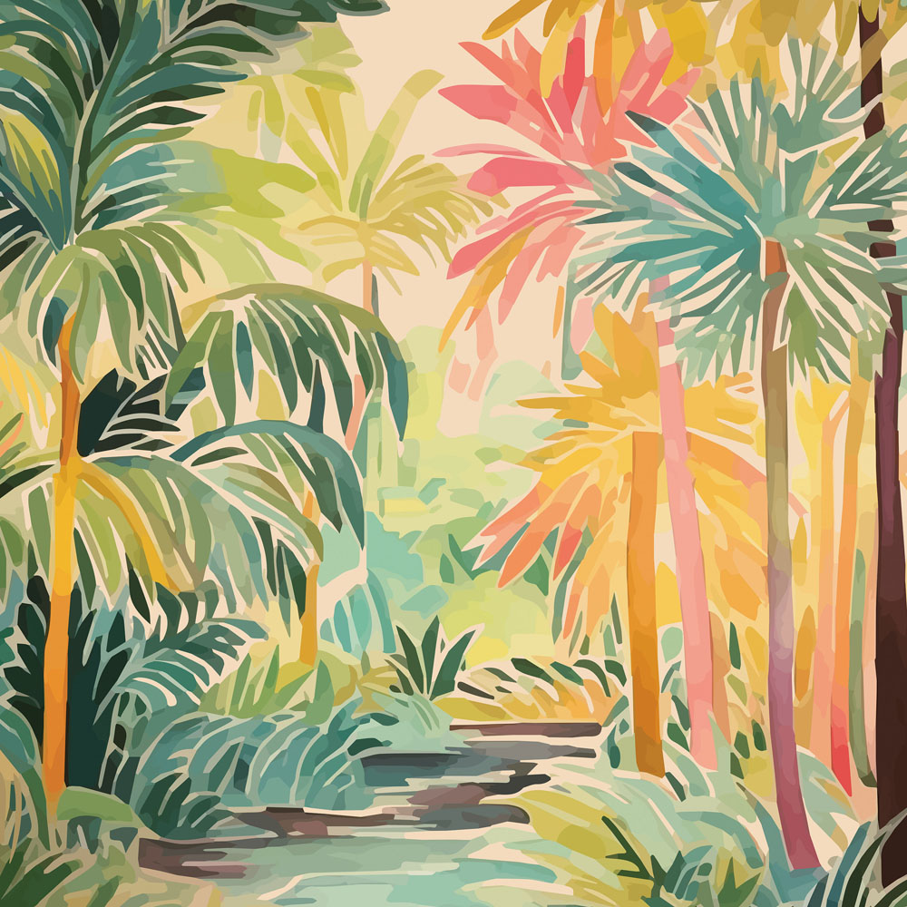Transform your space with the Pretty Palms Green Wall Mural. This captivating design features a tropical scene of palm trees and layers of leaves and foliage in watercolour, with the tall trunks creating height and dimension.