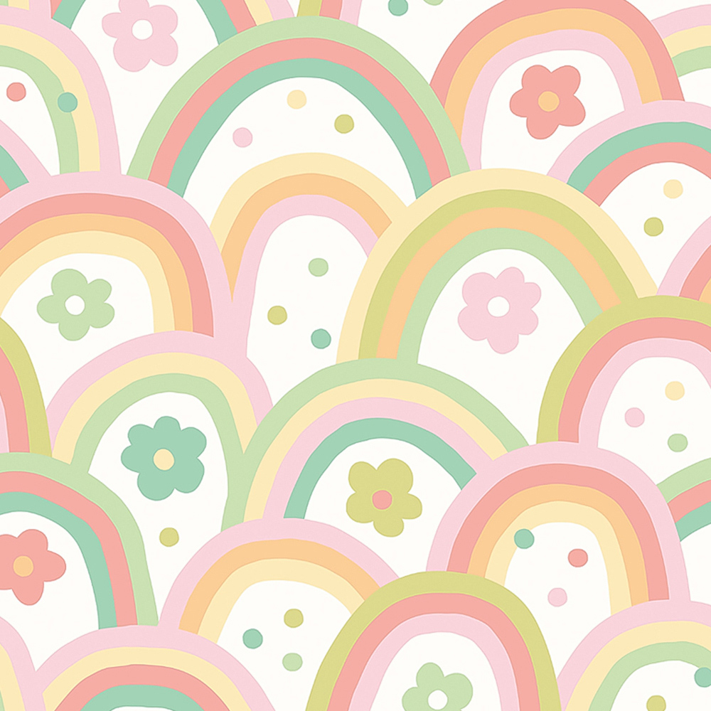 Inject a playful spirit into your home with this charming design. A delightfully wobbly rainbow, punctuated by simple polka dots and scattered flowers, creates a retro and cheerful atmosphere. This design is perfect for adding a touch of whimsical energy to any room, uplifting the mood and adding a unique personality.