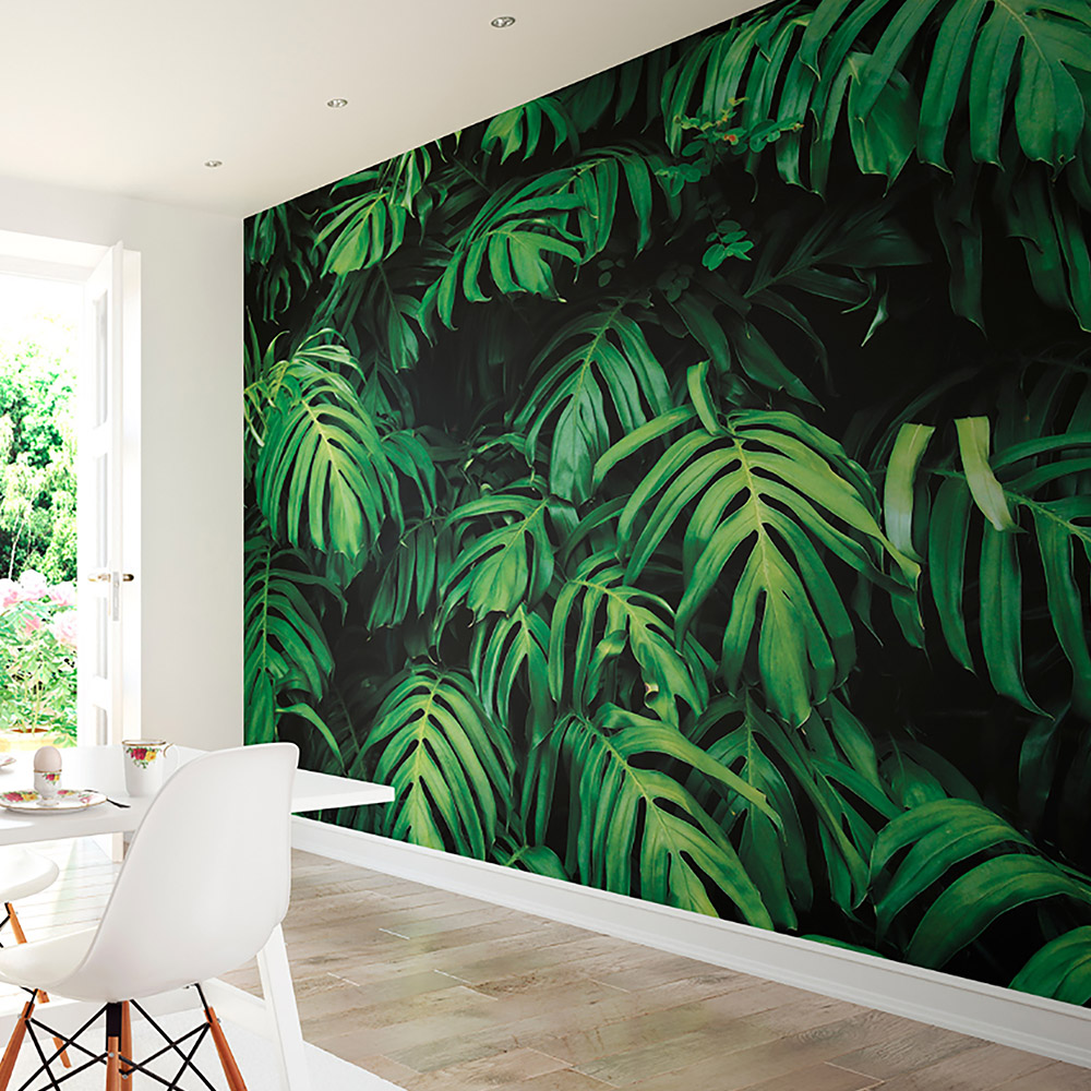 Transform your space into a lush, vibrant haven with this dramatic rainforest-inspired design. Rich greens and deep shadows evoke the feeling of a dense, thriving jungle, bringing the sights and scents of the rainforest to your walls. The abundant foliage creates a sense of organic depth and earthy richness.
