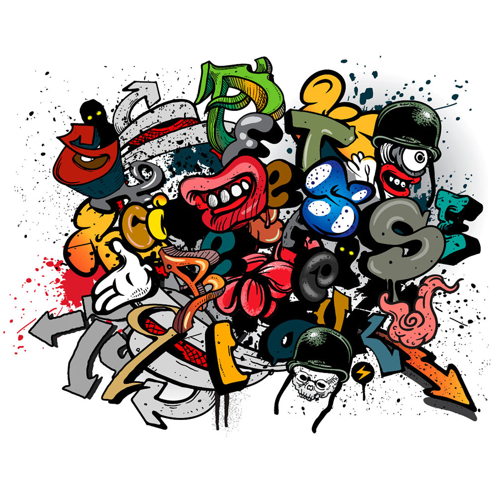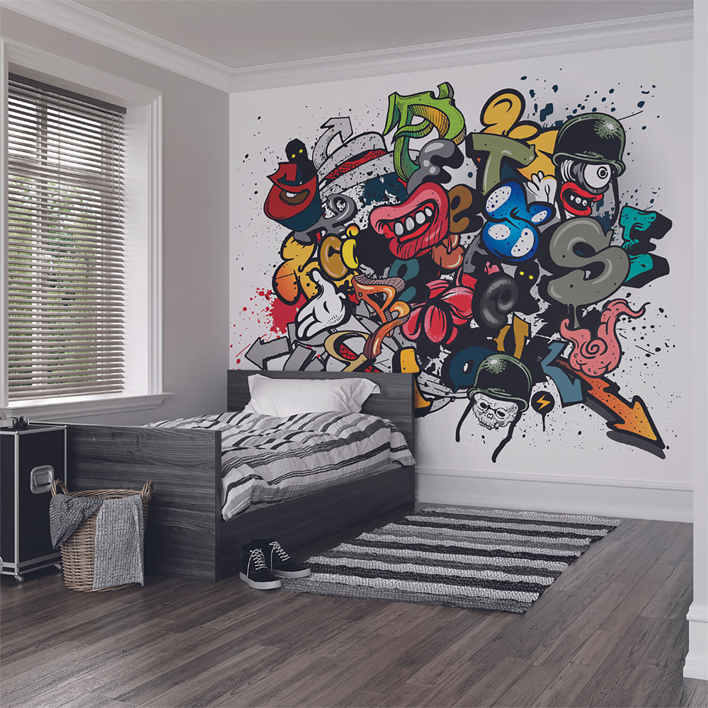 Bold and unconventional, this wallpaper boasts a striking graffiti-style design. A vibrant clash of colours and characters creates a truly urban aesthetic, adding personality and edge to any room. This statement piece is perfect for those who appreciate unique design.